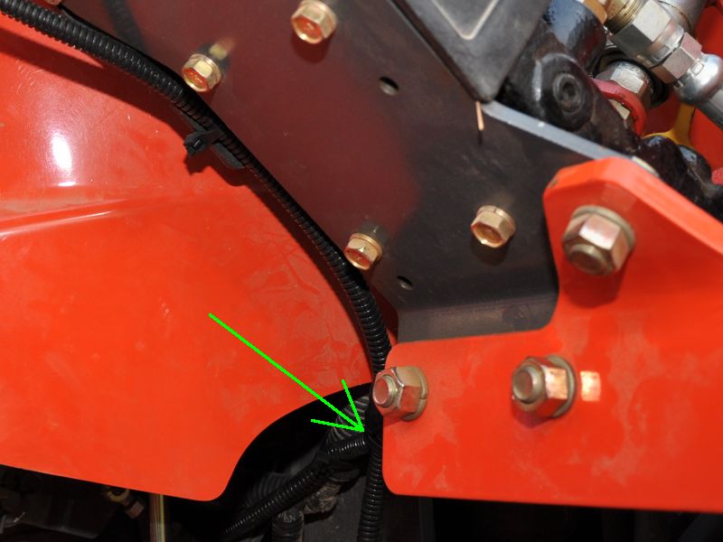 4. I routed the thumbswitch wires down the joystick while the joystick was in the detent float (all the way forward) position to make sure I had a little slack in the wires at the back edge of the FEL valve shield. I then drilled two 5/16" holes through the inboard side of the shield to which I could lash the wire run after sheathing. (Pic 18) I used UV zip ties through the holes to secure the run. Eight inches or so below the lower zip tie, I separated the thumbswitch hot lead from the black solenoid leads and sent the hot lead across the tractor in the void space behind the firewall. Pic 19 shows the split on the right-hand side of the tractor, and Pic 20 shows where the hot lead emerges on the left-hand side next to the bottom left corner of the fuse box.