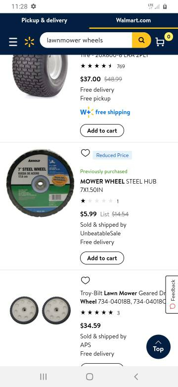 I needed two 7" steel lawnmower wheels, so I checked different online places...then notice they're on Walmart site $5.99 each free shipping! So I order them...except when time to pay it tries adding $20.58 shipping!