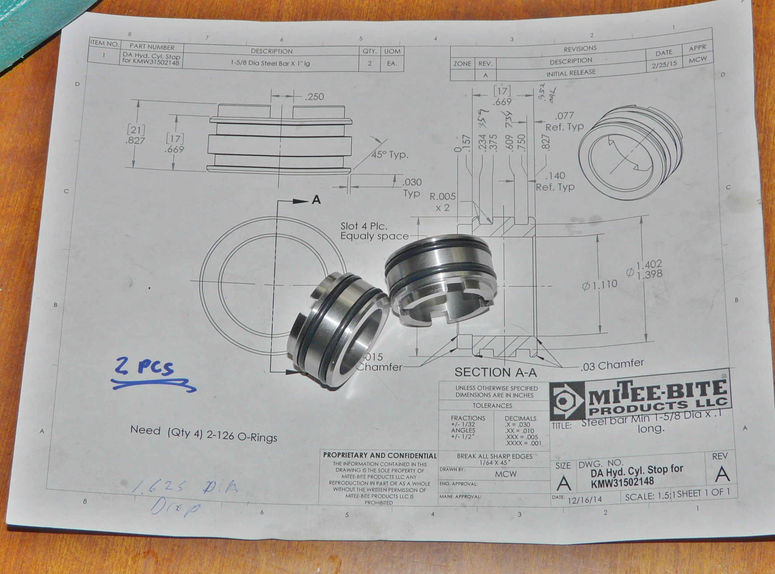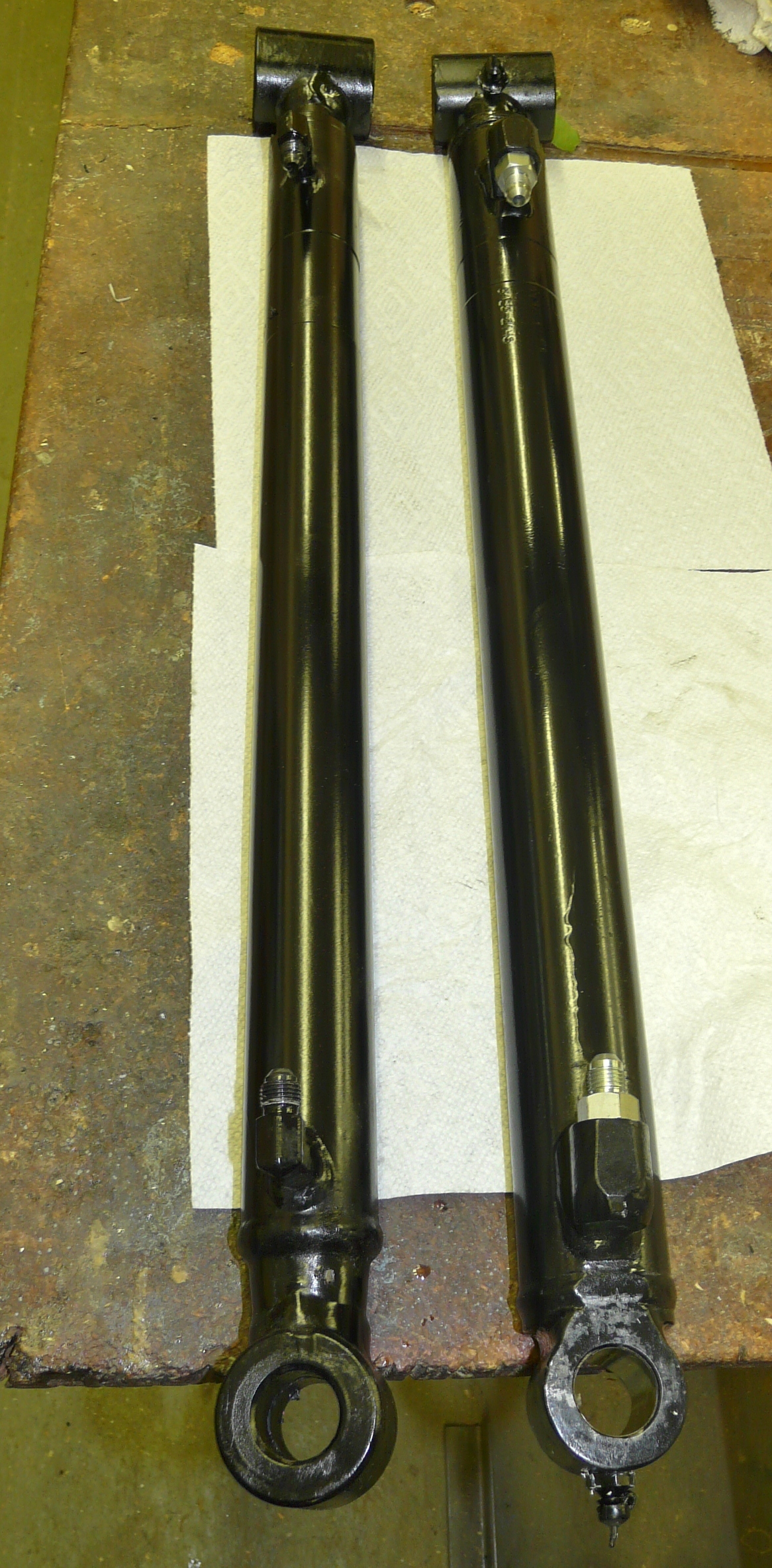 Today I machined the cross tubes to fit the ML205 loader. I will test fit the cylinders to verify that my stroke limiter dimensions are correct before I ask the shop to cut them. The Pin holes are 1" and the Pins are 25mm. I will probably line the cross tube bores with shim stock to take out the 1/64" extra play. The 40mm cylinders from the 1526L do not look much bigger than the 35mm OEM ML205 pieces, but the retract force increases 56%.