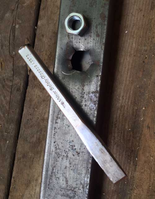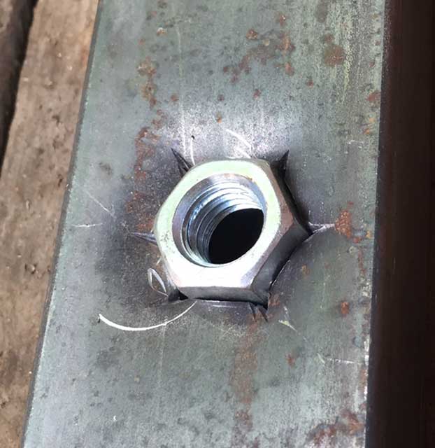Pound the nut into the hole flush, and weld it up.