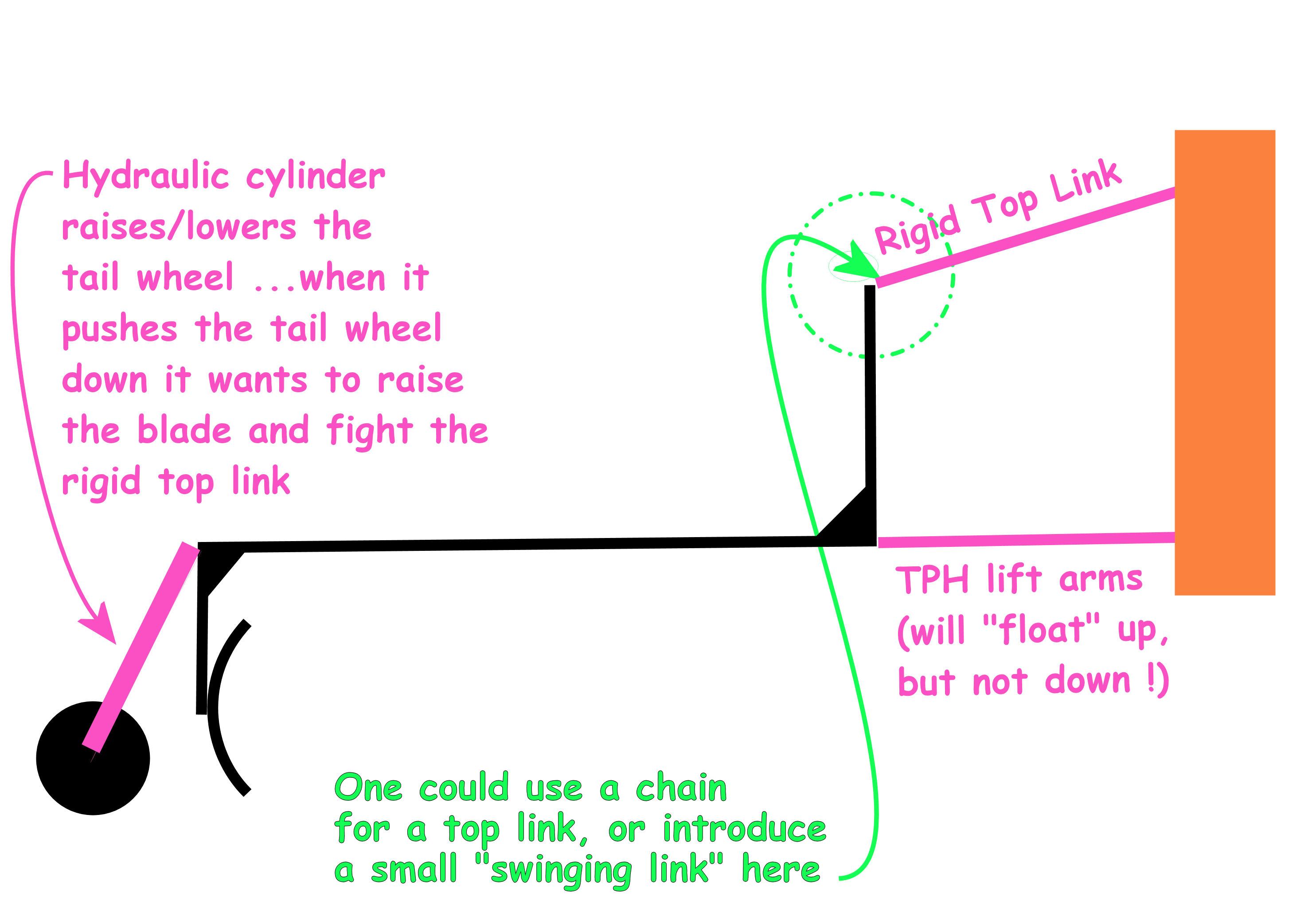 Candyman, I think you are going to have to hook up to that blade and take some photos. Maybe some before and after your friend welds the adapter plates on to show everyone the problem and the fix if it works. I dont think the top link distance will change a lot if you just drop straight down. The lift arms are on a circular tangent line and fartherest away from the tractor should be level, then get closer as you lower or raise from that point. Since you are lowering your arms to hook at the bottom of the possible lift the 3rd arm distance wont change. You will have to make sure that when you raise it all the way up, that it doesnt get into your tractor as the higher you lift it, the closer it is going to come> I know some of my implements get really close to the tires when raised as high as they go and you will be exceeding that by at least 8" looks like. Just watch closely when the first lift happens for tire to bar clearance. The other pinch point is going to be the 3rd arm watch closely as you come up to make sure it doesnt jam at the tractor or the implement since you will be raising much higher, I think you may find that you wont have clearance at the tractor and possible on the blade either. You could modify the blade but not the tractor so watch those three points.