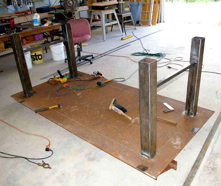 I have four lengths of six inch flanged ductile iron pipe just waiting for some I-beam and a thick plate to make a table. If and when I get some decent space to set up, I will set up one end with alternating square tubing instead of solid table. That is, open space equal to the tube stock so I can slip hold down clamps through the gap.
