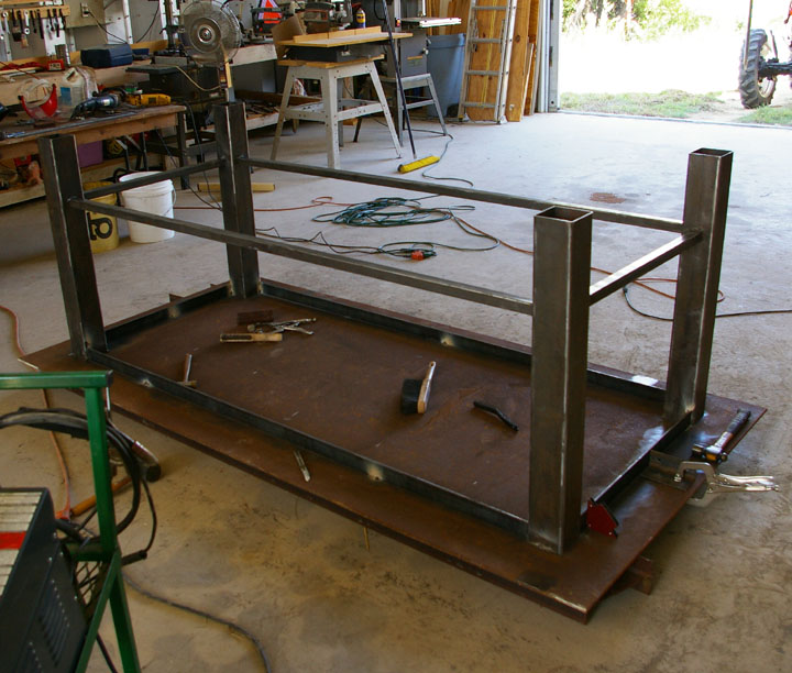 Harv, No expanded metal deck on this table. You can't see it in the pics, but there is a 24' workbench along the wall not ten feet from where the welding table is setting. That workbench has 90% of the tools needed either on it or under it. The other 10% is in a toolbox about three steps away. But you are right about the reason to have the deck under the table. But, there will be a bar welded to the legs on one end to hold clamps.