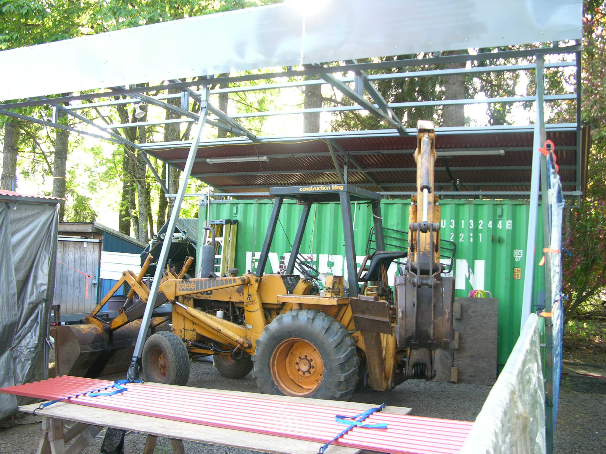 A few more - Those "wall of chips" pix are for the 3 "leg adjusters" on a 24' square roof I built over a 20' container - roof's done now, sides are tarped temporarily - Roof's modular and removable in sections if necessary, but for now it'll give me a dry place to work on anything up to the 580B (which you can see has just enough clearance to drive under) - I can't afford a second shop yet, first one's full of woodworking stuff so I "make do" - once I get a slab poured, those splayed out legs will end up resting on the slab, lagged to it.