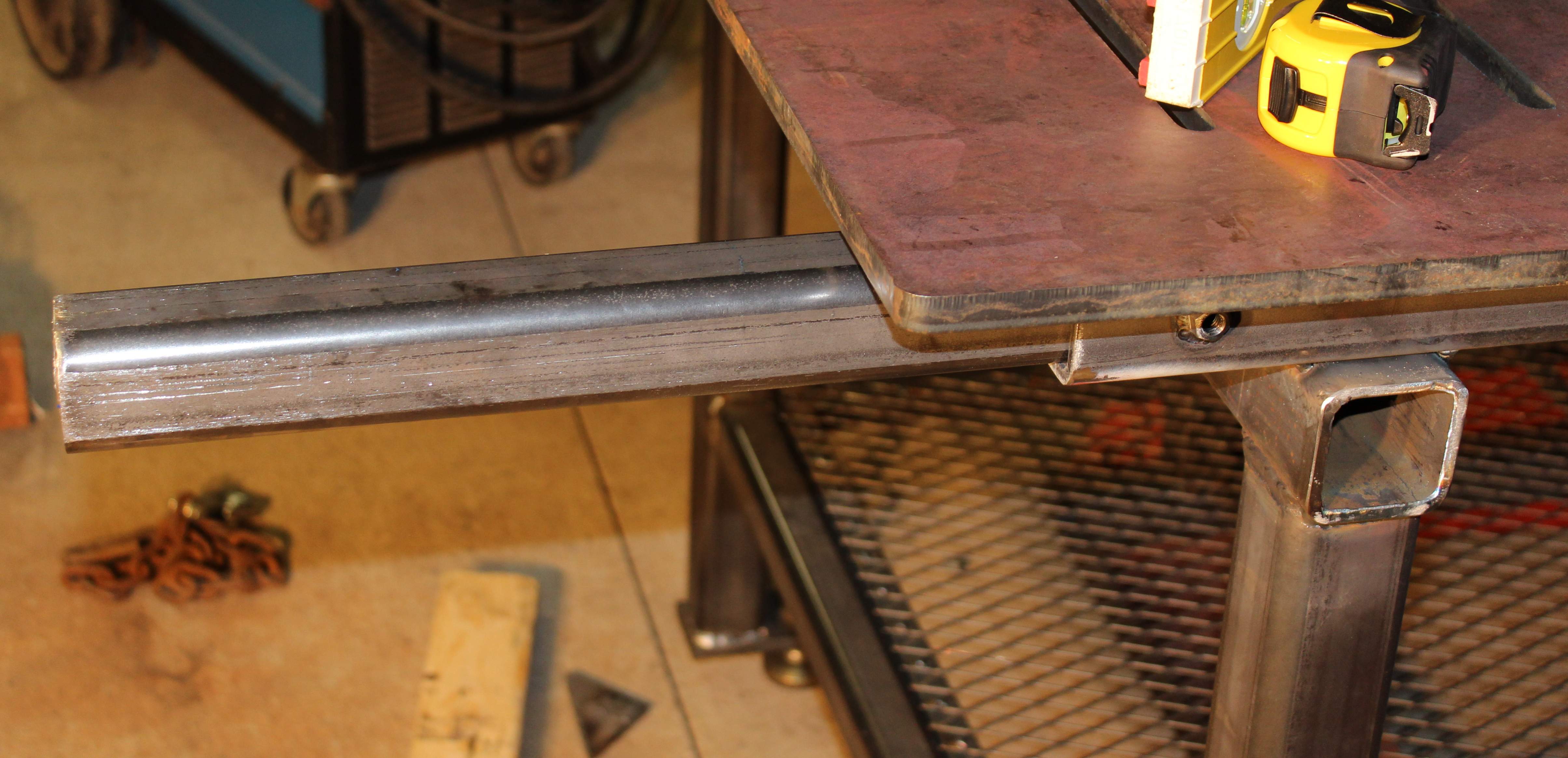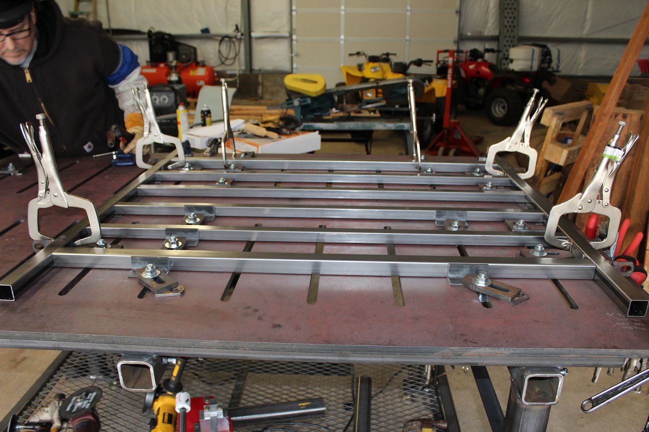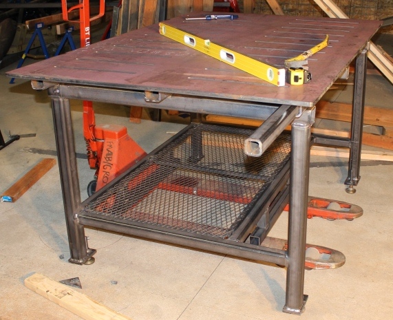 I finished building a welding table a while back and thought I might post some pics and see what you guys think. This was my first welding project of any size. I built it upside down and started with a 4'x6'x5/8" plate into which I had 5/8" inch slots cut by my metal supplier. I started by putting the plate upside down on 4x4s. Then I shimmed it up to get it as flat and level as possible. The frame, for the most part, is made from 2"x1/4" receiver tubing, the spreaders are 2"x1/4" stinger tubing. I elected not to put casters on it because my previous experience has been that tables with casters are never completely stable. Instead I put some extensions under the shelf so I could move it around with my pallet jack or the forks on my tractor if needed. I TIG'd 3/8" nuts onto the receiver tubing near the ends so that I could clamp my vise and other tools mounted on stinger tubes into the various positions around the table. I have 12 places where I can connect my vise.