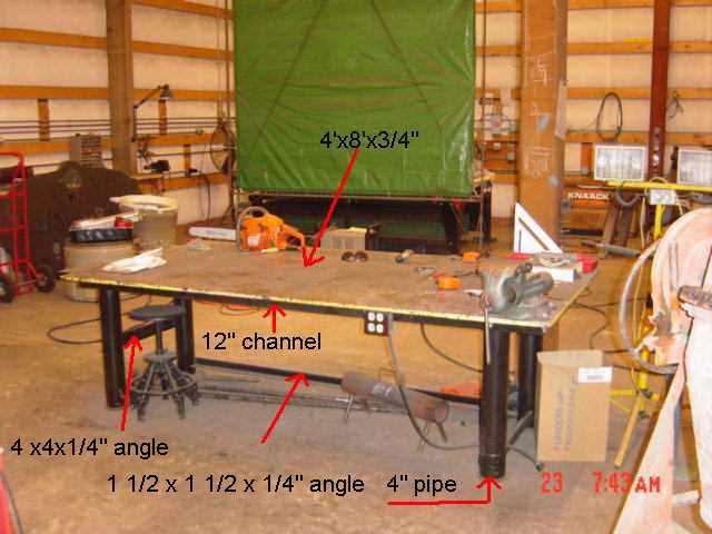 I've got a set of metal legs I was thinking about putting a top on to make a small welding table. It would be about 3' square and about 3' tall. My projects won't be that big and I'm a bit space constrained so I figure it would work for a base that won't catch on fire. Might build a small shelf underneath to hold the welder. I was thinking 1/4" plate for the top.