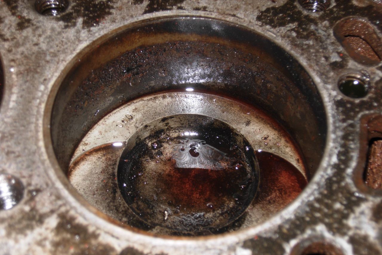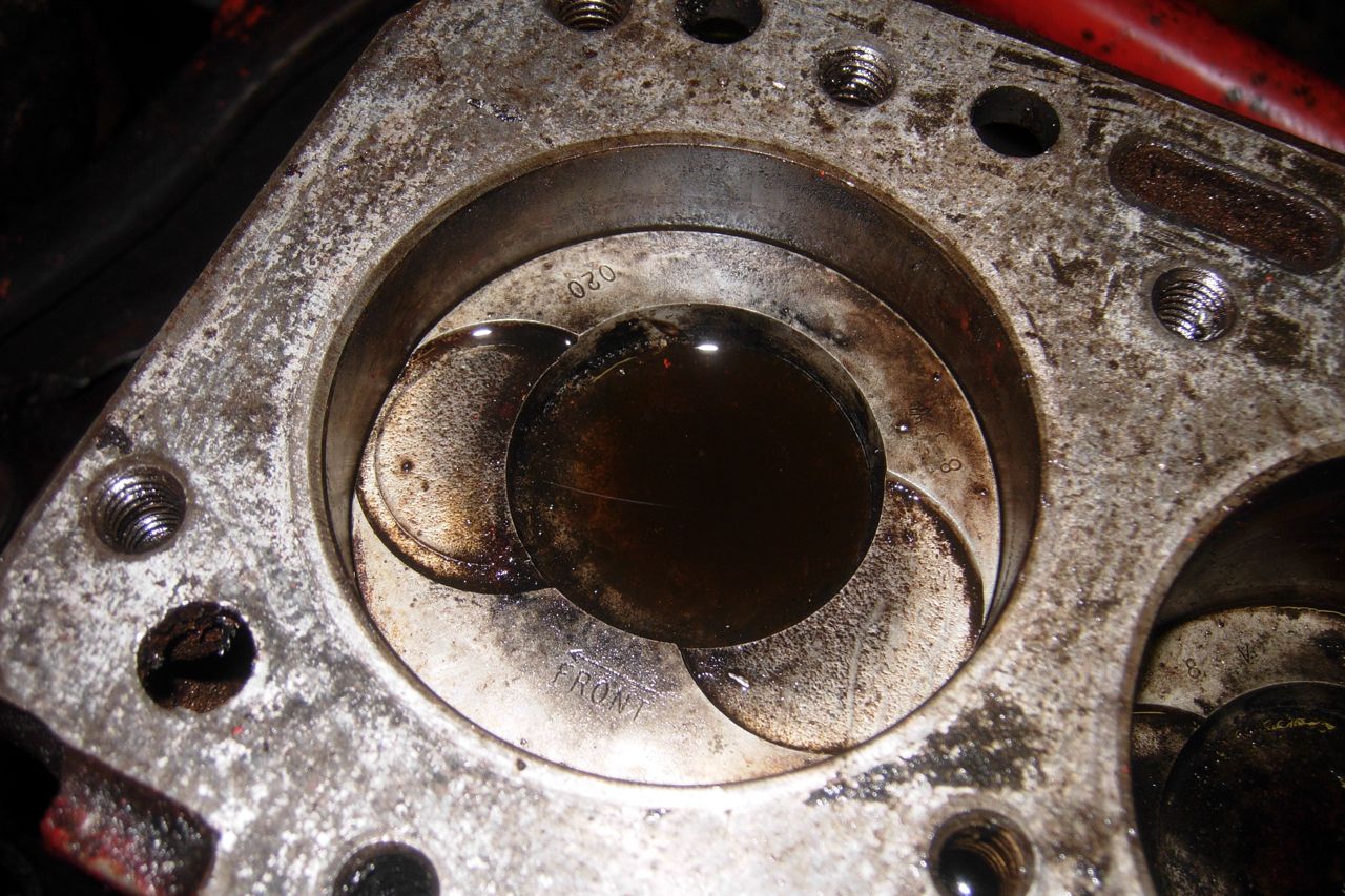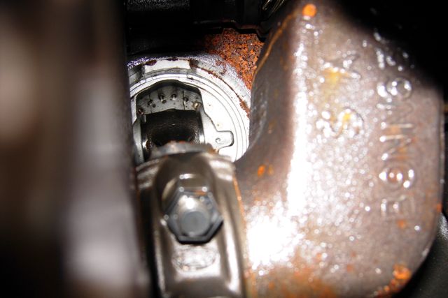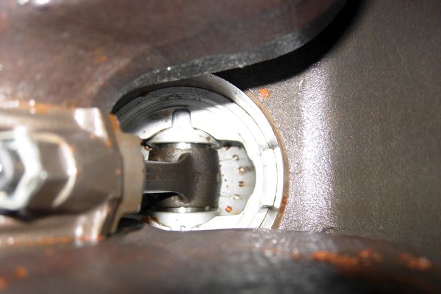 Here's Cyl1 (counting back to front) from above and below. Note the heavy carbon build-up/rust? above the piston, and some rust that was visible from underneat before I was able to free the piston.