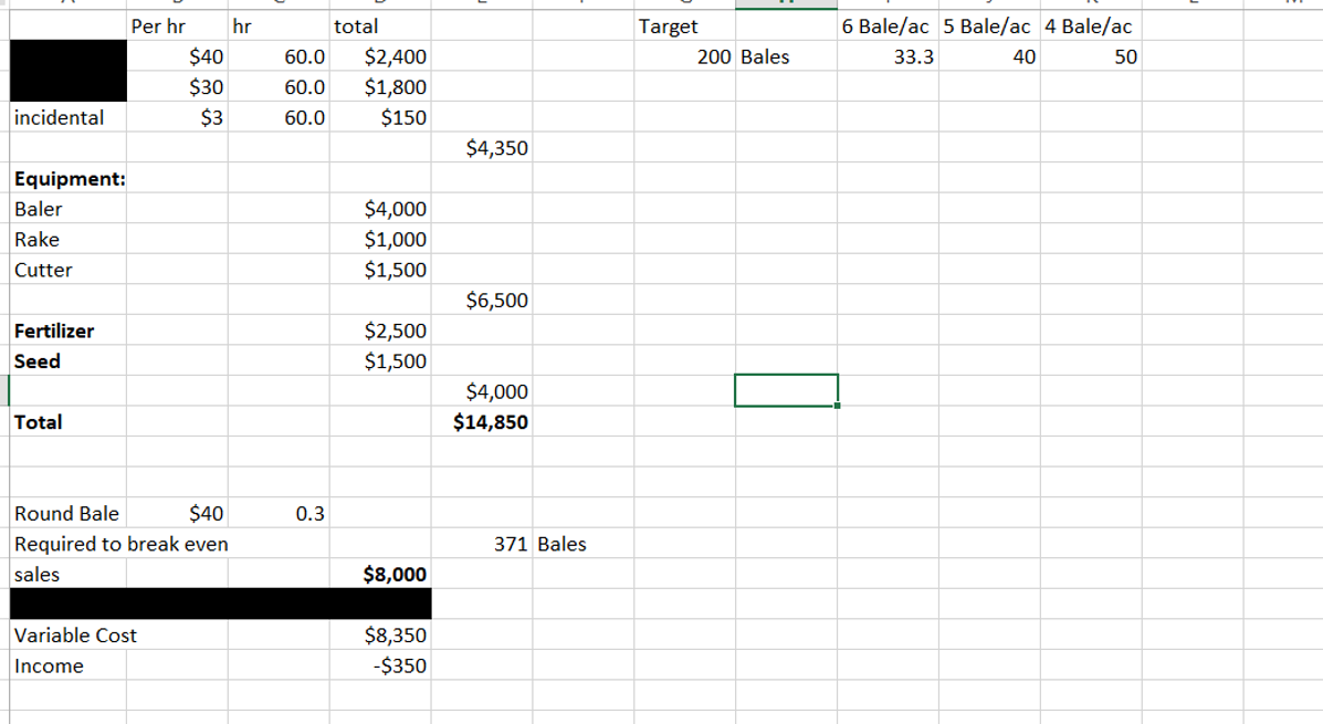 Everything else is pretty self explanatory I think, at the end of the day I'm losing money baling hay just at variable cost let alone trying to pay for the hay equipment but if I keep $2k or more in hay for myself that makes a difference.