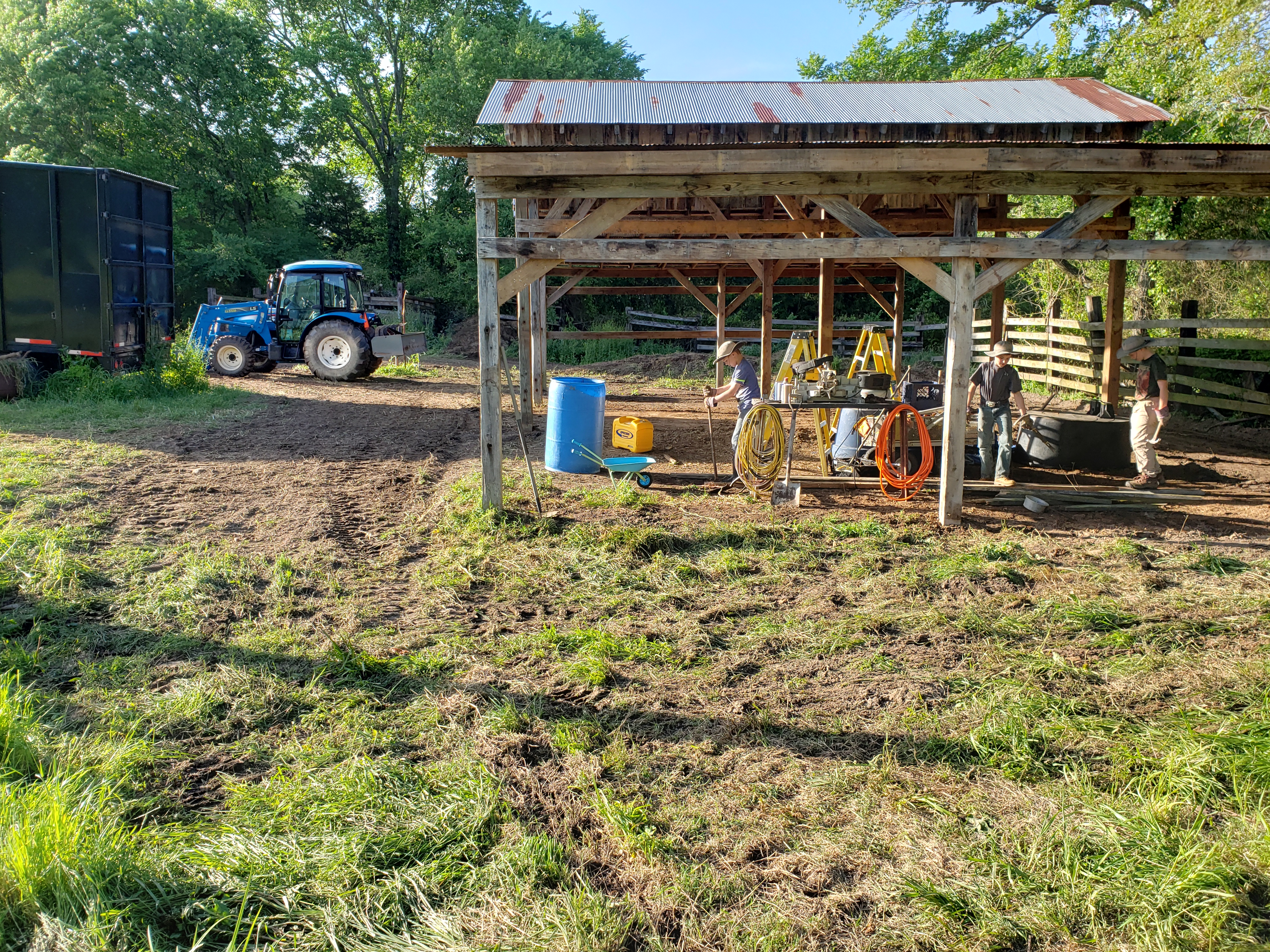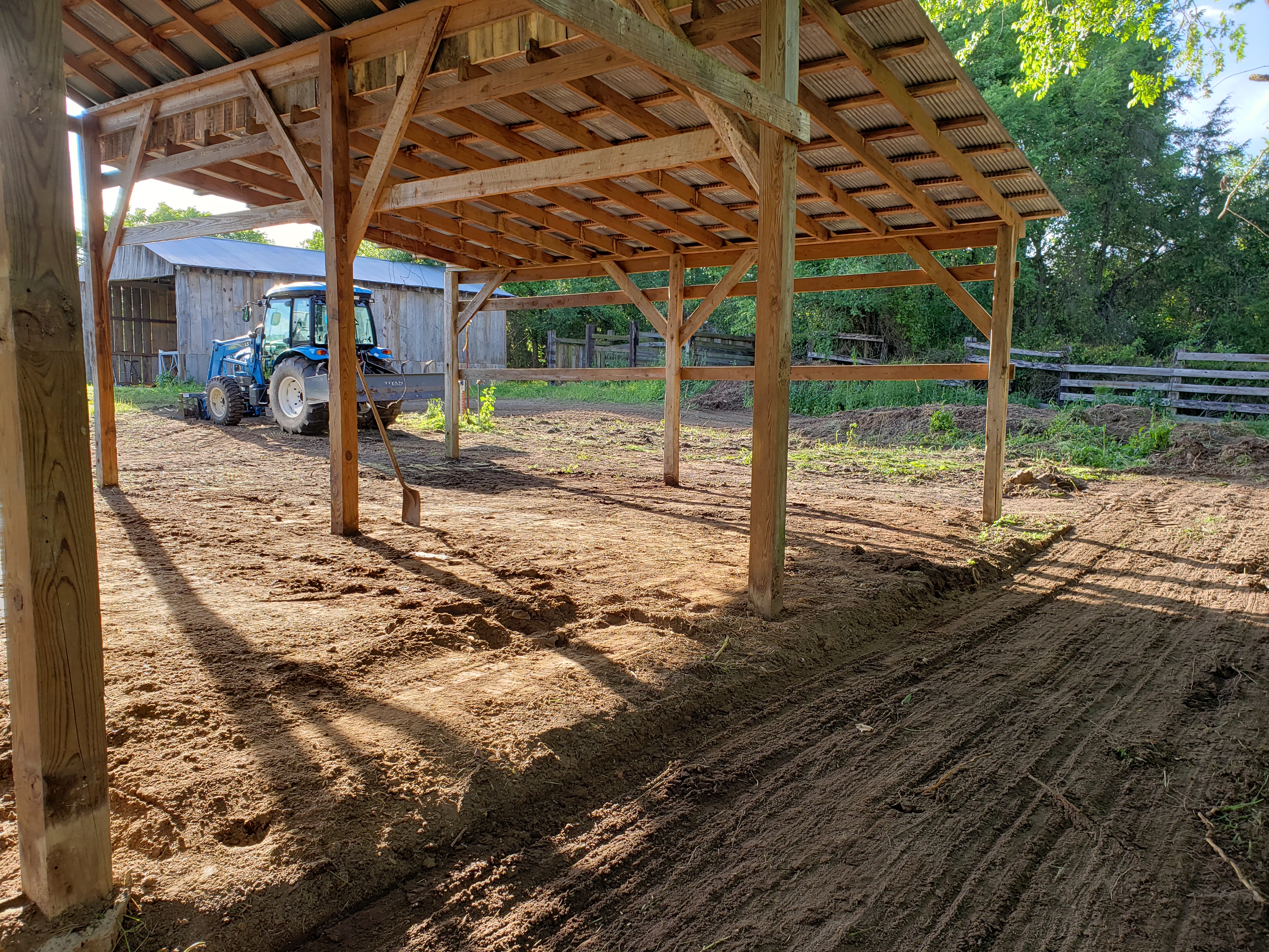 This is this week got ground around old barn cut down to let water go around not through it. Got all the old manure dragged out of building about 8 inch in each section! This building when we started had half the roof flapping in wind every time it rained and all the siding was rotted 16 inches up the sides and half the sidind supports were broken. Now I need to put some of the bigger rocks we dug up around it along the walls and go get some gravel to fill inside and level floors then equipment and tractors will have a dry place to sleep! Its 24' x 44' and center is 11' thinking of putting a rack in back of middle section to place implements on that dont get used all the time put them up with forks from tractor!