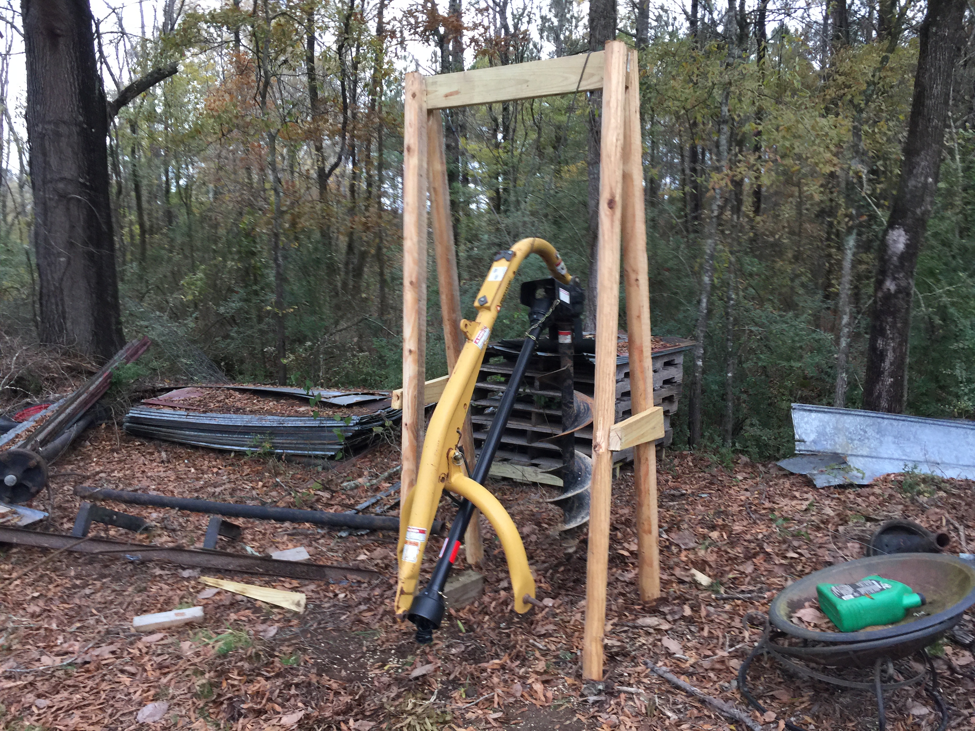 today I needed to take the PHD off the tractor. Man those things are about the most aggravating things to hook up and take off....So, I searched out 'post hole digger stand' and found one that was quick and easy to build. Less than 20 bucks, of course I did have a few pieces of scrap lumber laying around, but even at that, if I'd had to buy another 8' 2x4 it wouldn't have put me over $25. I made it so I can move it, as I am working on cleanup and fencing on that side of the yard, once I finish that, and settle on where to put it, I'll put the posts in the ground in concrete. Didn't try to hook it back up, but it sure made unhooking easy