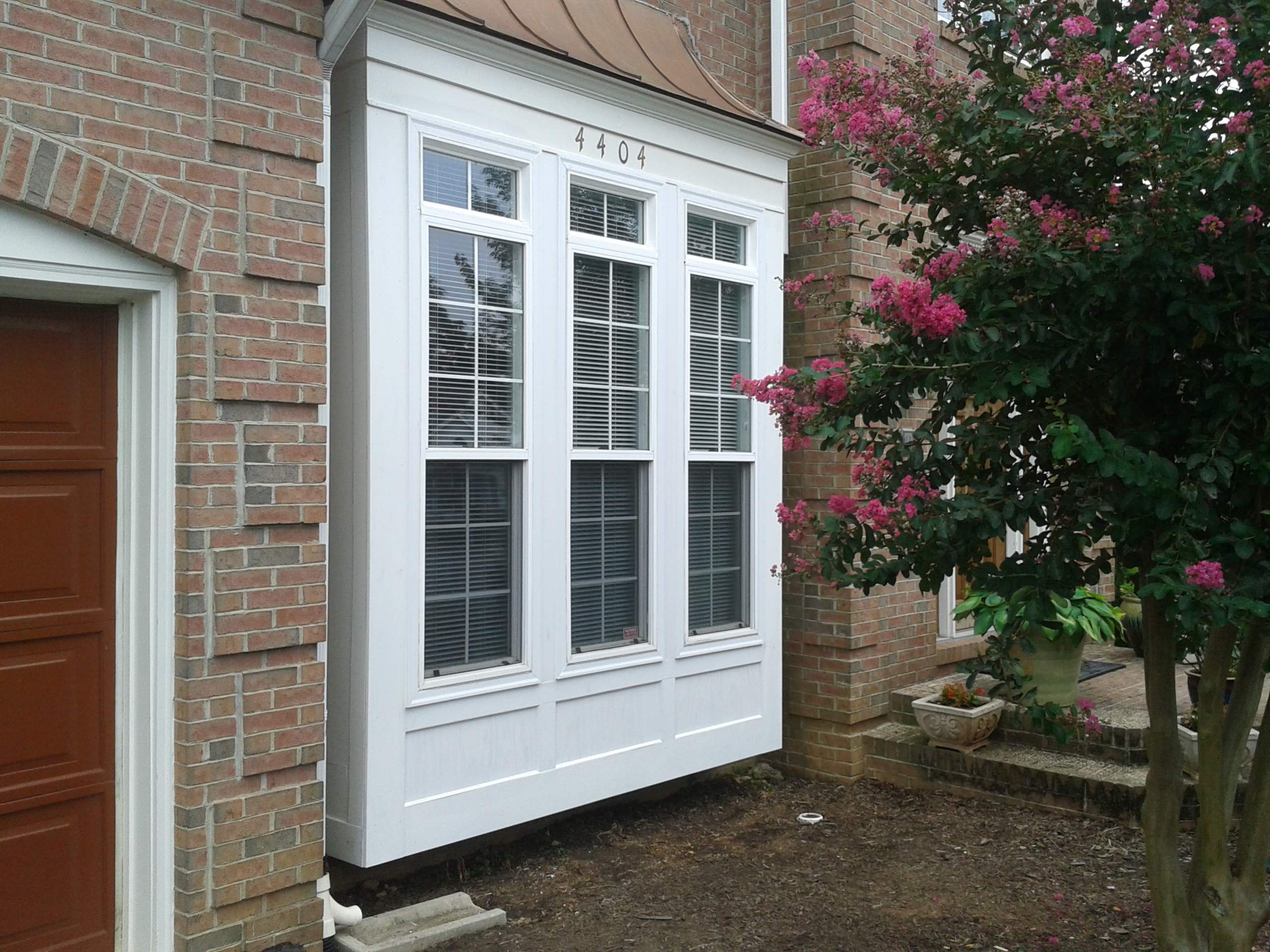 Thursday we added a large sction of 1/2" OSB from the bottom of the windows to the bottom, added a Tyvek moisture barrier over the whole face, and started on the brick mold. I had made a command decision and I spent the evtra $$$ on pvc trim boards that will NEVER ROT. all the brick mold, 1x4, and trim is PVC, the 1x8's are "Armor Board" supposedly good for 30 years. the decorative molding is PVC, and the 1/4" plywood insets are primered on all edges and the back. This should NEVER dry rot again. Materials cost me about $300.