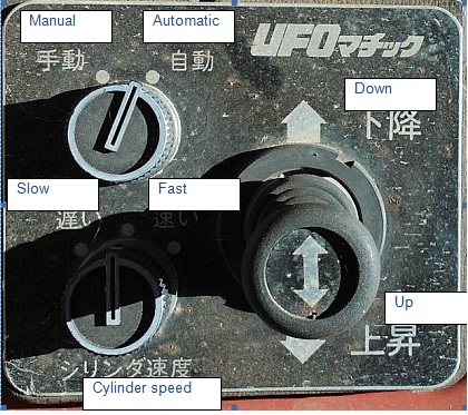 from the photo PhilY uploaded i see that my smaller knob is for switching from auto and manual(same japan letters).bigger knob is for up and down, in my controller this knob goes sideways, but the same result.the roller is for leveling. ok if im thinking right, now i know functions of knobs ant roller.but on auto and manual mode bigger knob and roller seems to do different job.