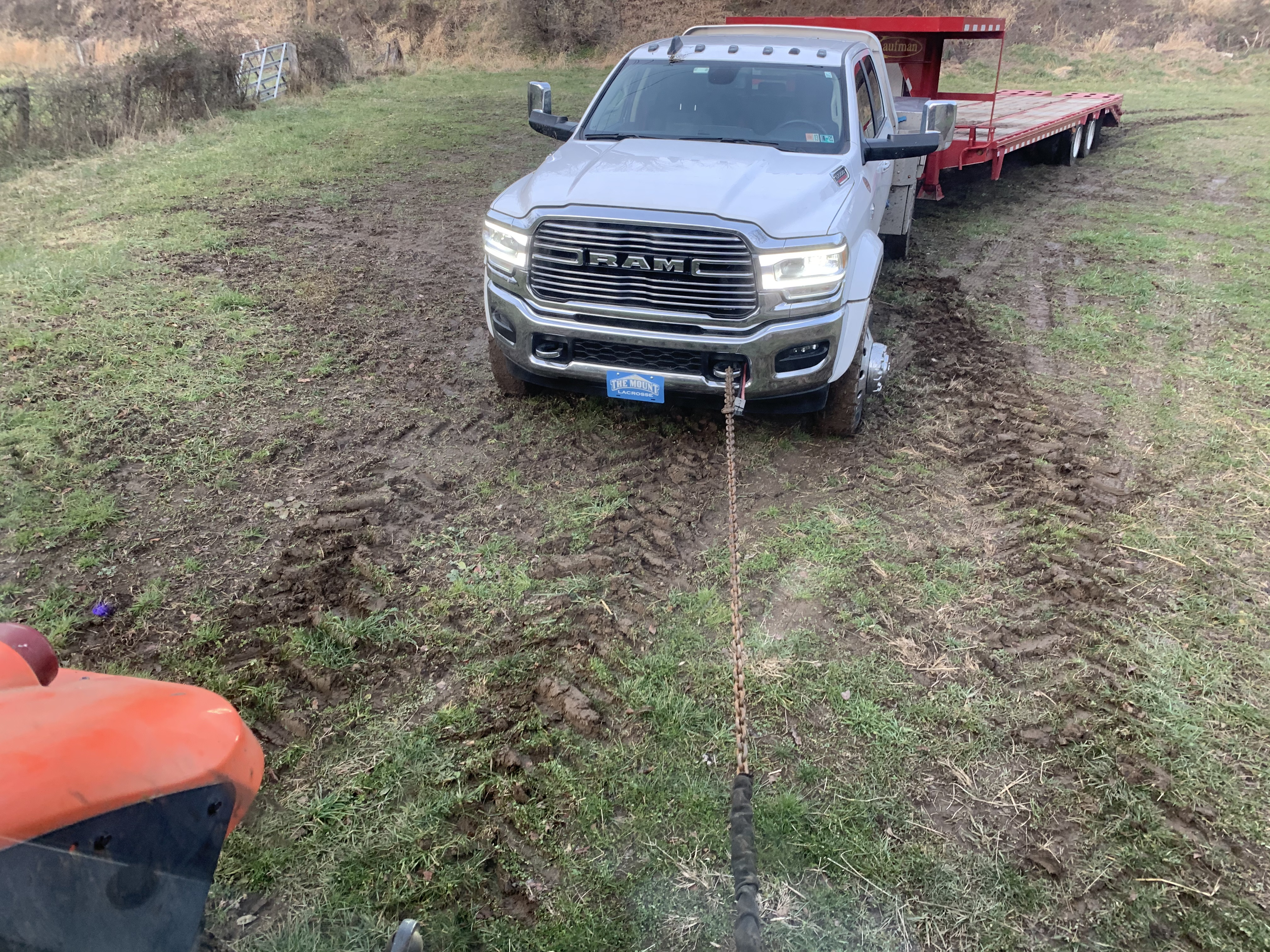 I was happy to find out my RAM front tow hooks are plenty strong. Nothing more slippery than frozen farm ground with 1” of thawed mud on top.