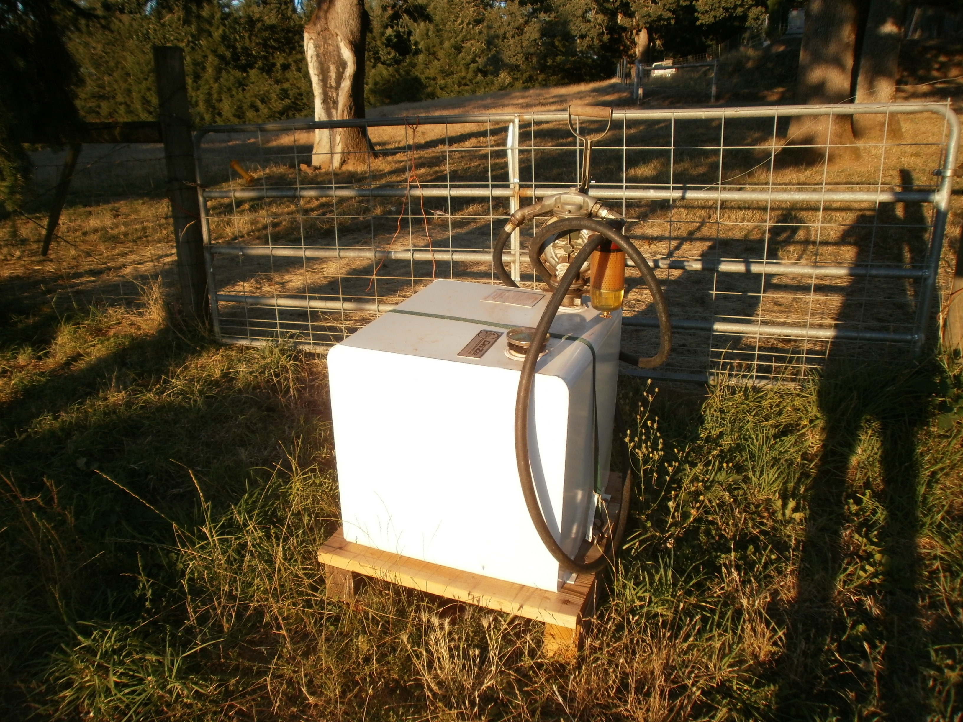 Haven't read all this thread but here is my solution. Same 50 GL square tank as logger above. Added wheels plus ability to lift w/FEL forks. Hand pump and 10 Micron water absorbing canister filter. When lifting be sure to tie on as it is top heavy. Lost one once because of not tieing done, steel to steel slides easy. I have one for Gasoline and one for diesel. Treat both with supplements when filling.
