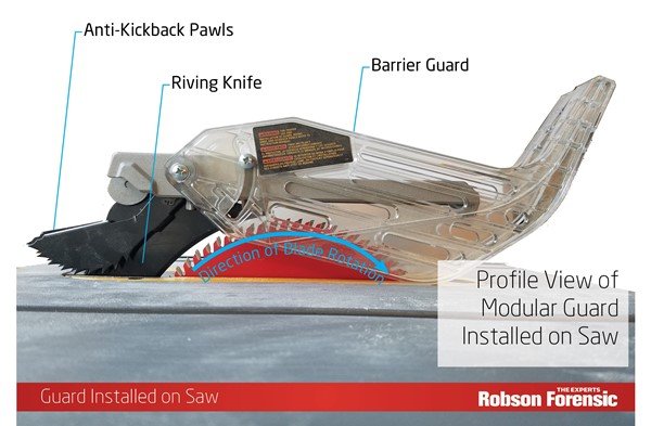 It looks almost like it has a anti-kickback device on it as well, something sort of like this:That's a riving knife. It will prevent a cut from closing back together when ripping a board with wonky grain, leading to a pinch and kickback, but it wouldn't have any effect on plywood and it won't prevent all kickbacks. If a board somehow gets crooked between the fence and blade, there could still be a pretty bad kickback. I had that happen once and it was like getting kicked in the gut.