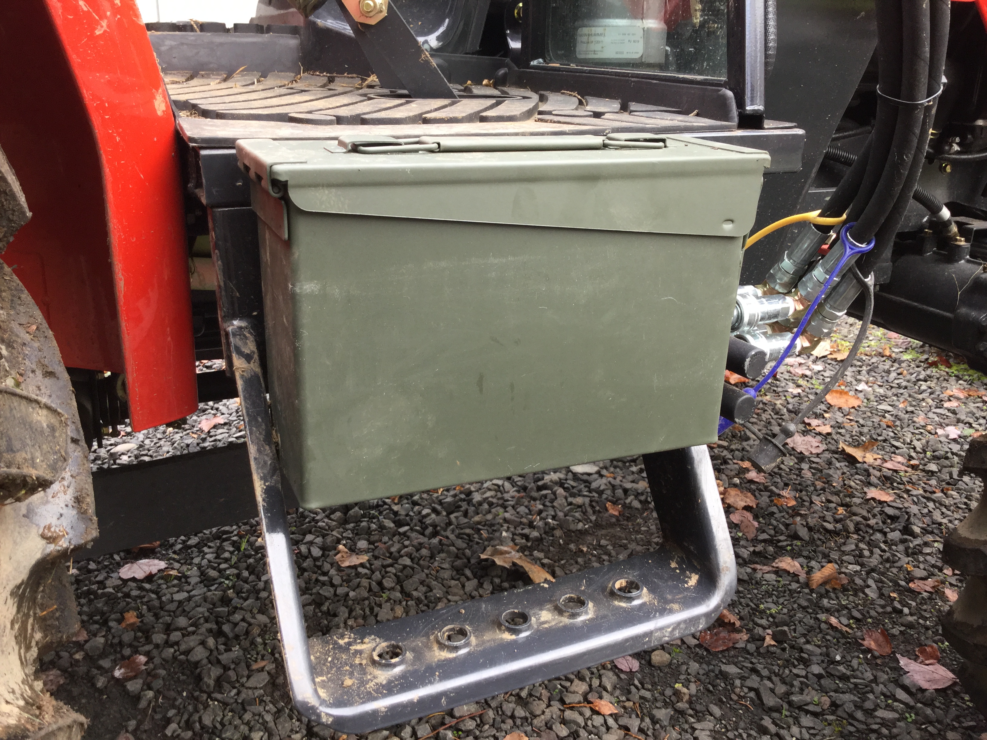 I was inspired by your toolbox placement and decided to to use the same location on our 3725h. My wife suggested placing magnets on the backside of the ammo box so that it could be removed when needed, which seemed like a great idea. I found two 95 lb. circular magnets at Harbor Freight and bolted them to the back of the box. Because the box sits above the tapered sides of the step, it can't creep down more than a 1/4 inch before hitting metal-on-metal, keeping it snuggly in place. So far, after loading it up with tools and using the tractor a lot for bucket work and pulling logs, the toolbox has not budged. To release the magnetic grip from the tractor, you just grab the back bottom corner of the box and give a good tug. The toolbox is in a handy spot and the step can still be used. Another brilliant idea by my lovely wife! Here are a few photos.