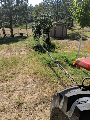 Unfortunately one of the posts I put in for this new fence a couple weeks back had a change of fence direction on it that was bigger than I expected when planning - I thought it was going to be small but it ended up being an unbraced 20 degree bend, and the post got a tilt from the fence tension. Yesterday I dug a hole inside the bend to pour an anchor for a diagonal brace (thankfully the bend is outside the yard so a diagonal brace won't be generally in the way); today I used the tractor to gently pull the post straight... it's parked to hold it while the concrete that the diagonal brace (now attached to the previously leaning post) is in sets for a couple days...