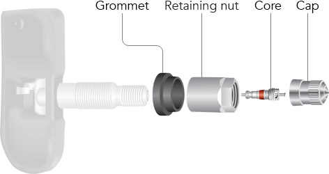 The metal TPMS rebuild kit includes the rubber grommet, retaining nut, core, and cap.