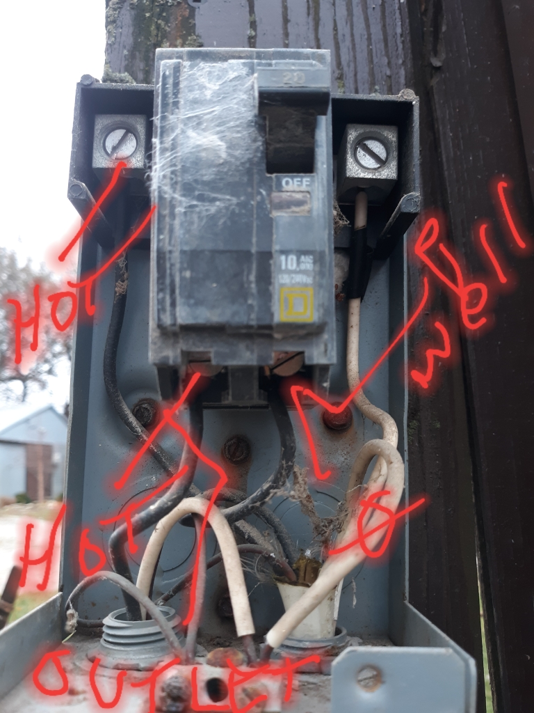 Forgot to mention the well pit is right next to this breaker, and this breaker is fed from a disconnect that's about 2 feet away, and the disconnect is fed from a panel that's right next to it. The whole thing could be reduced to a breaker in the panel and 6 feet of wire, so I have no idea how this all evolved. I'll figure out the best way to fix this some day when it stops raining, but for today at least he can take a shower.