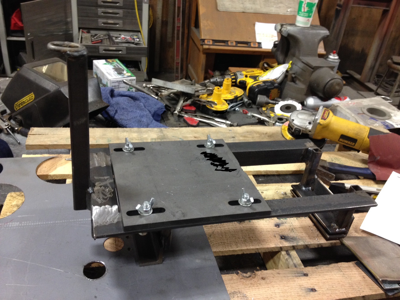 Another situation was drilling into the end of the locomotive for a device that mounts on the exterior. It requires two small holes and one large hole. Picture a Mickey Mouse head pattern. The car is stainless and a mag drill won't stick. The material being drilled is two pieces of stainless steel about 3/16" thick and separated nearly an inch of air space. There is a very substantial rain gutter above where the holes go, so I sent a CAD sketch of the plate with the slots to a nearby laser shop and had them cut it out. Then had the guys in our weld shop make an adjustable mounting bracket. It uses the rain gutter at the top and secured via load binder strap on the bottom.