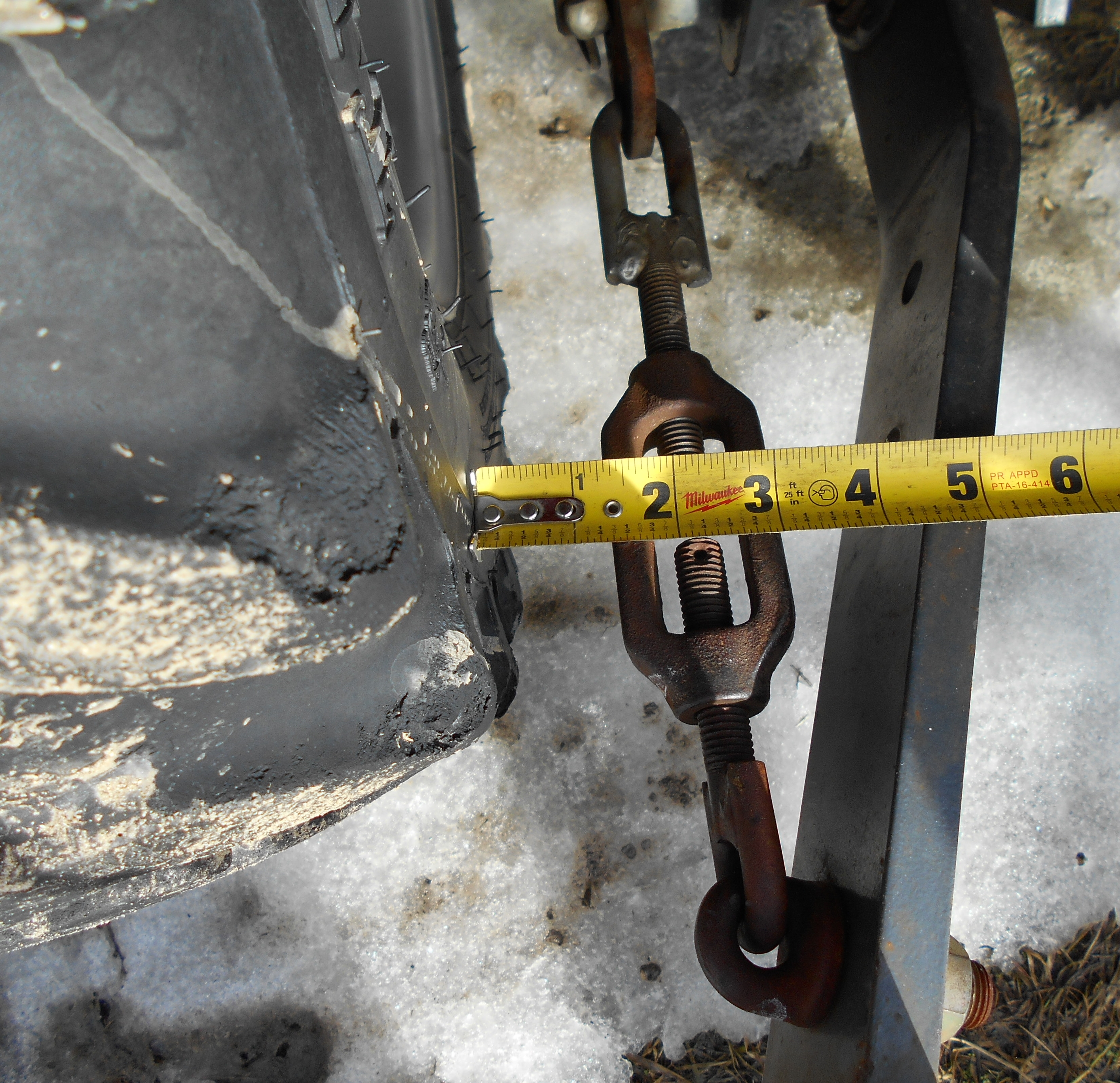 My 1815 doesn't appear to have this problem, lots of room front of tire to frame and about 1 1/4" rear of tire to 3-point turnbuckle.