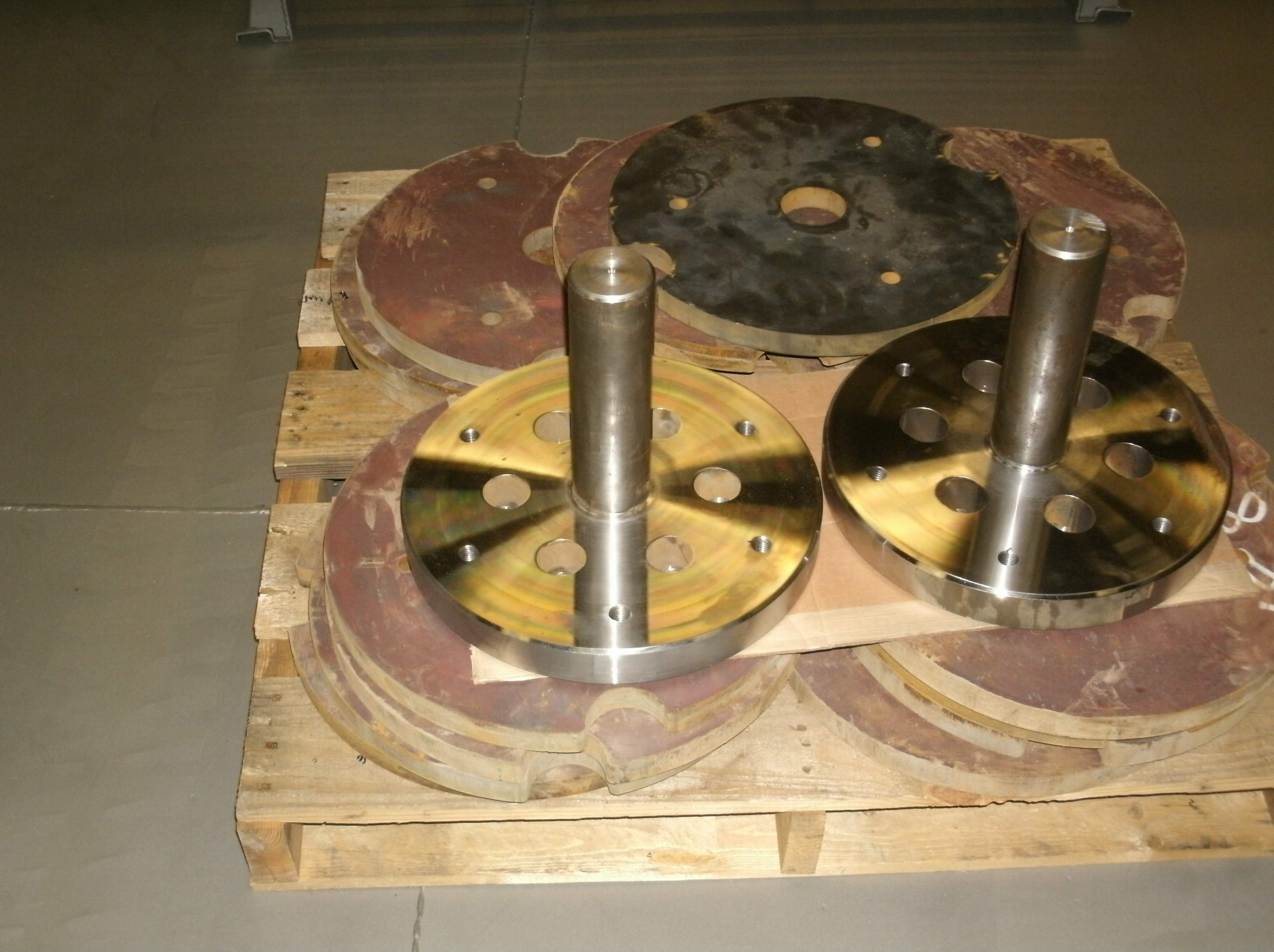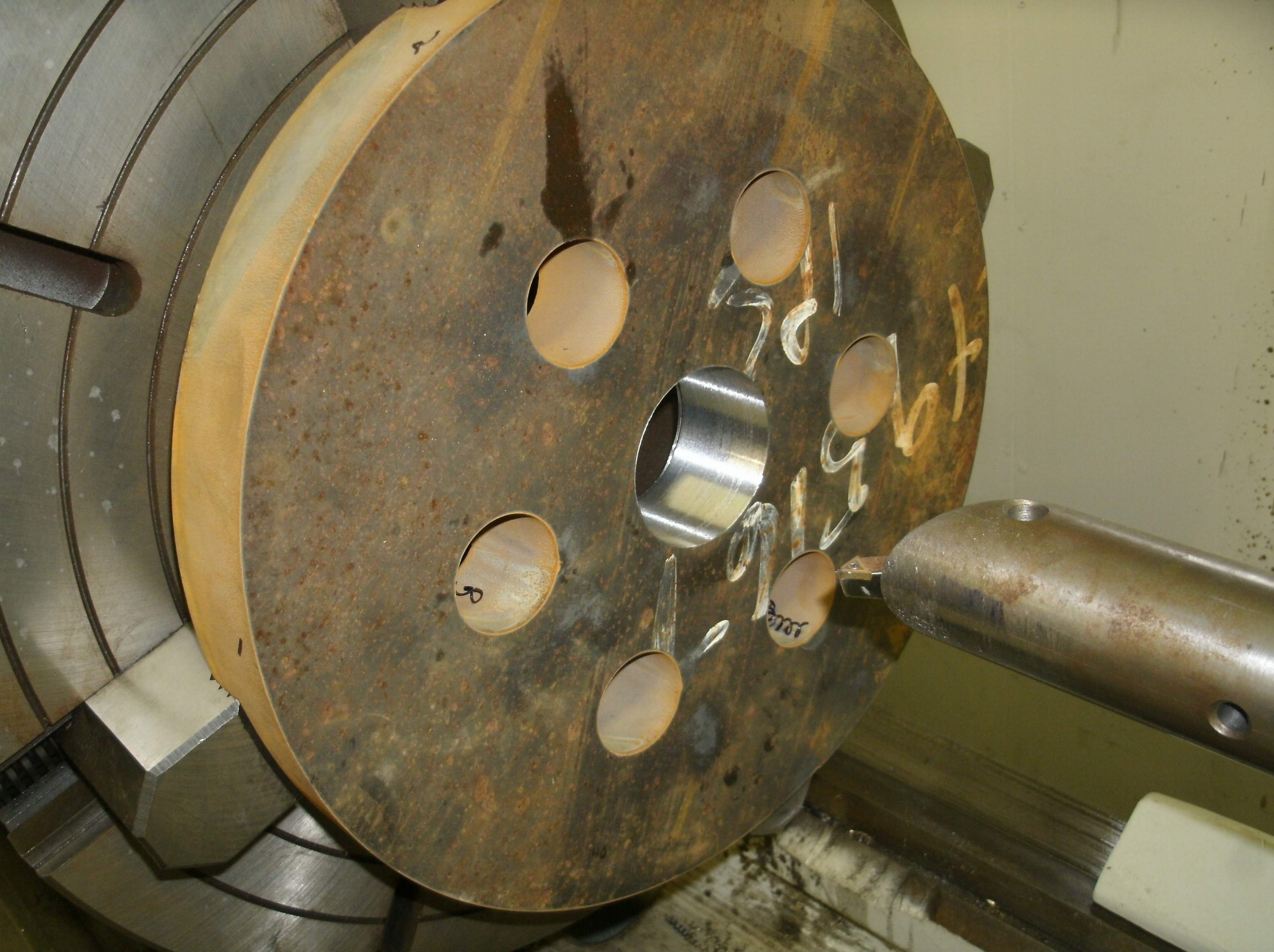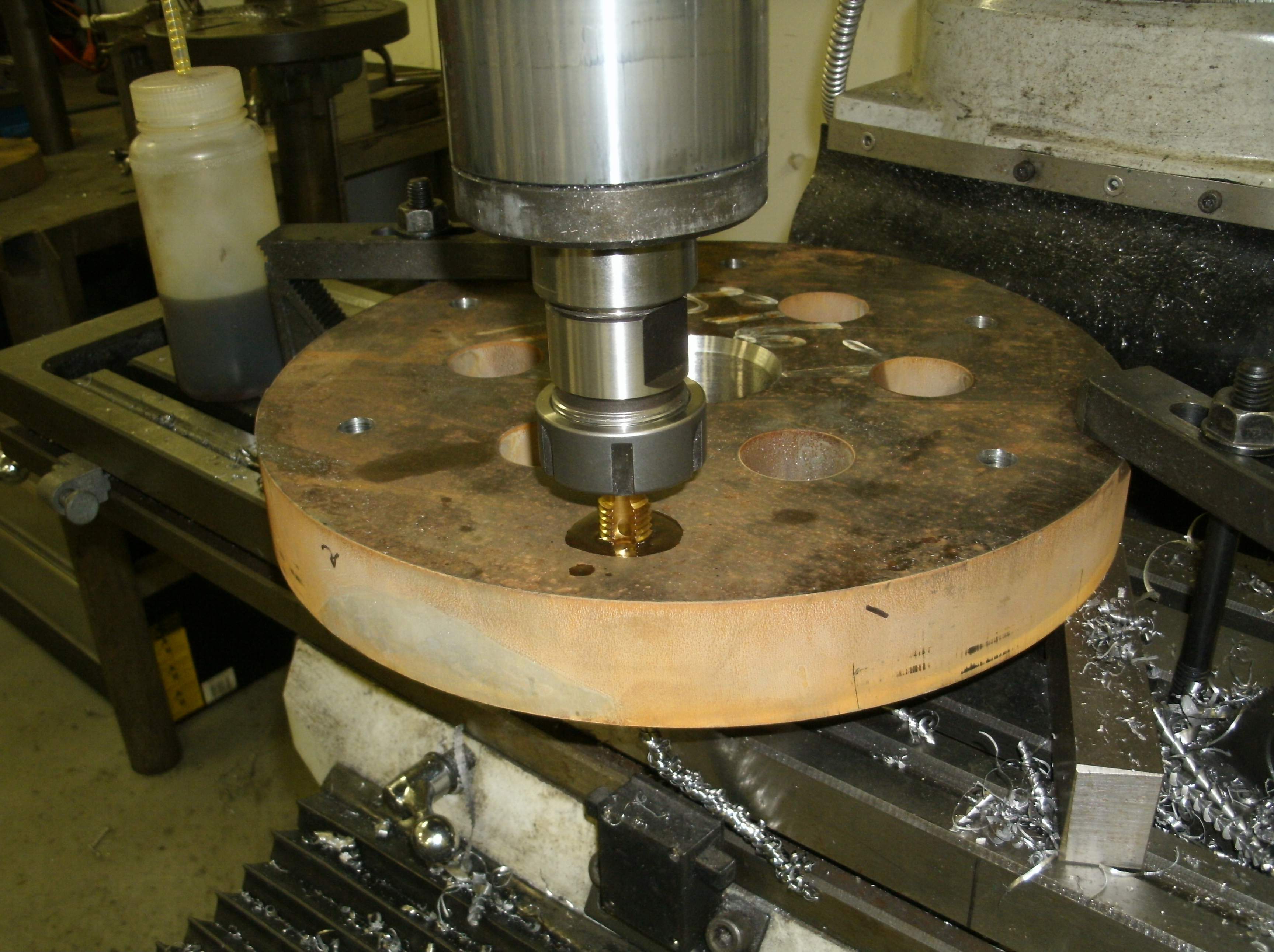 Need some rear ballast for my tractor and I don't want to make its footprint any larger because of some of the tight spaces I get into. So my wishlist goes like this: I like to fill up the center of the rear wheels with weights and I want them to be fairly easy to lift. My idea is for a mounting disc with a center pin so I can slide the weights on and bolt them up. The mounting disc is 1-3/4" thick x 13-1/2" so it will bolt up flat to inside the wheel. I had these water jetted with the inside hole slightly smaller than the 2-1/2 pin I'm going to use so I can machine it for a press fit. I had clearance holes for the wheel bolts so I can fit a socket through if I need to remove the wheel or torque the bolts later on. For the weights, I went with 1" steel plate x 16" diameter, total of eight per side. This should get me around 500 lbs per side plus I had the tires filled with Rimguard. The pictures show the mounting disc being machined for the center pin, indexing and tapping the holes for the mounting studs and the weight bolts, welding the pin in and the mounting discs after machining along with the individual weights. More as I go----