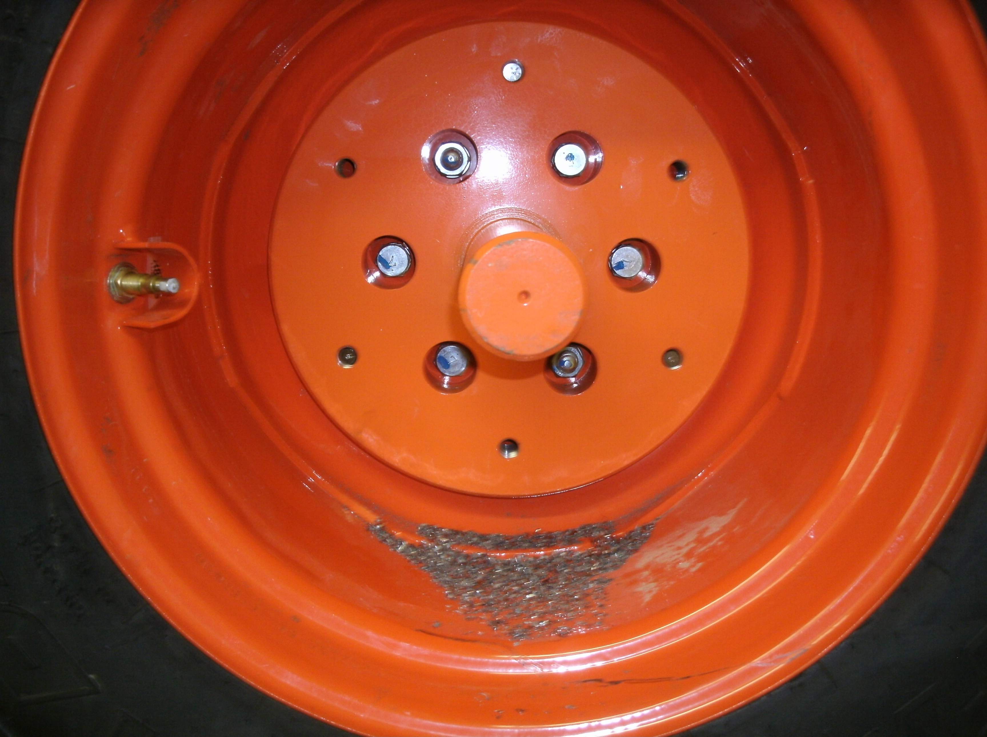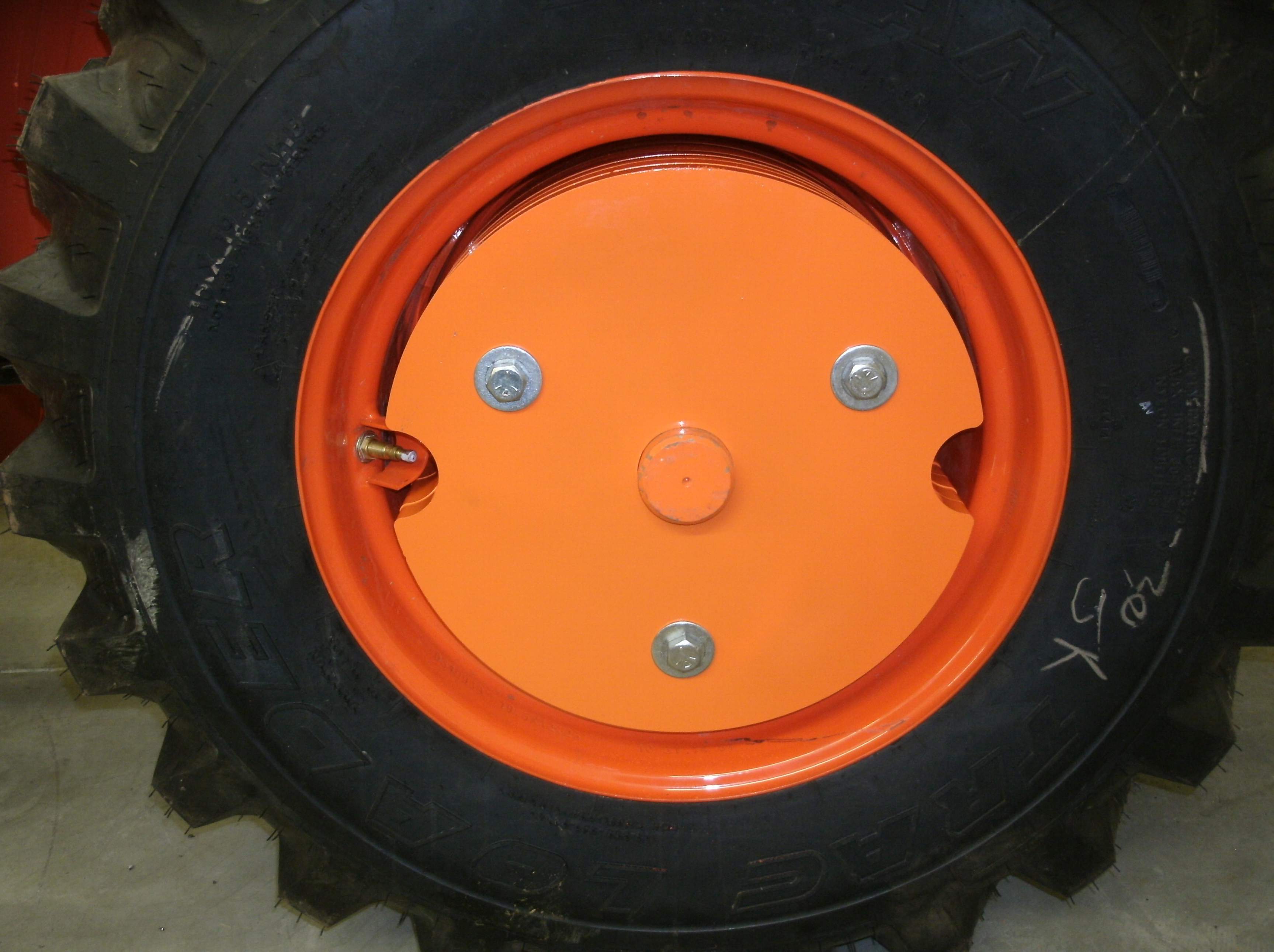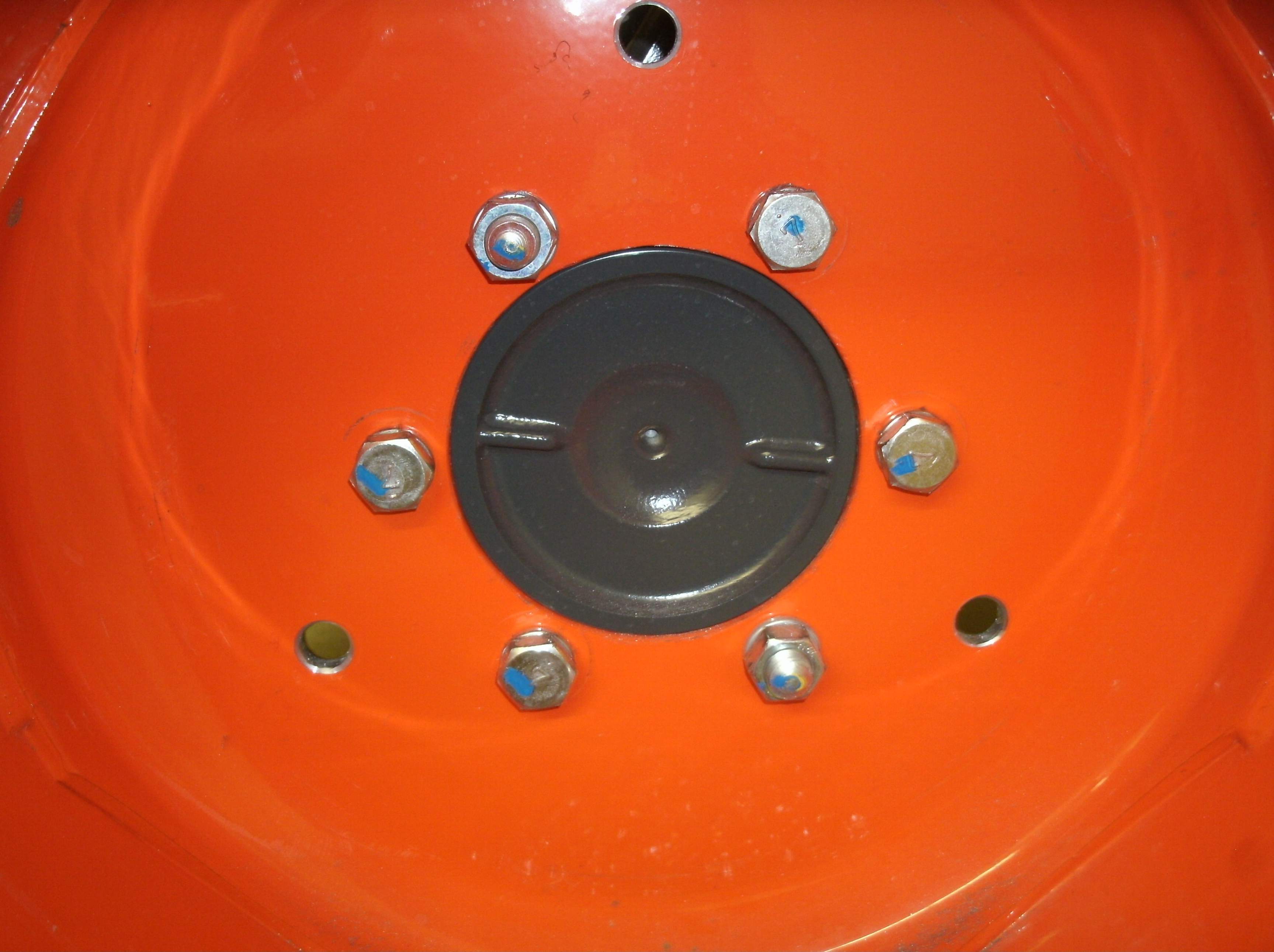 The first picture shows the least fun job of this whole project, drilling holes through the wheel! No other way to do it except by hand, but we got through it. The second picture shows installing the mounting studs with Loctite plus punching the threads for a little insurance. You'll also notice the male pilot hub I machined to fit into the pilot hole on the wheel. Kubota didn't give me much to work with, only about .075" but it should work. The third picture shows the mount installed and torqued. The fourth and fifth show the weights installed and how they don't protrude past the rim.