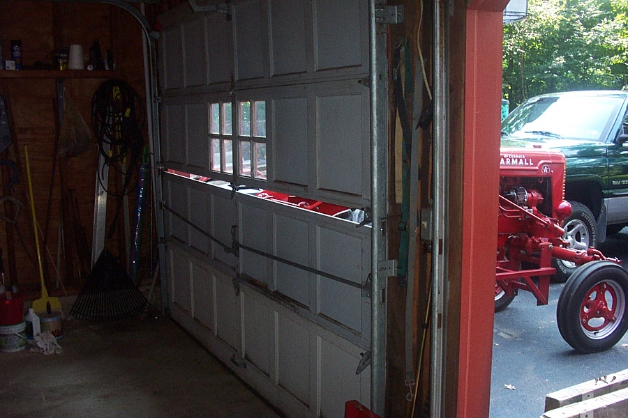 I just backed the tractor up next to the door and fit a scrap piece of 2x8 between the drawbar and the handle on the bottom of the door ! :) Then I disconnected the bad section and lifted the two upper sections just up far enough to get the bad panel out of the opening.