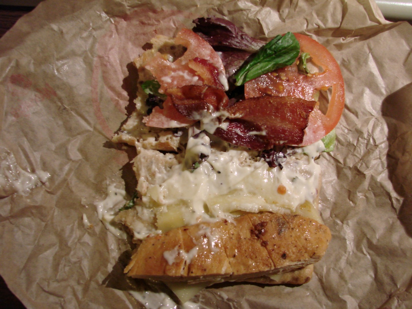 When I got home I quickly took two large bites and never tasted any chicken or bacon so I opened it up and looked inside. It sure didn't look anything like the photo in their commercials. One small slice of bacon and a piece of chicken that didn't even cover half the bread. I wonder if all Wendys make them like this or if I just have a rotten Wendys in my town.