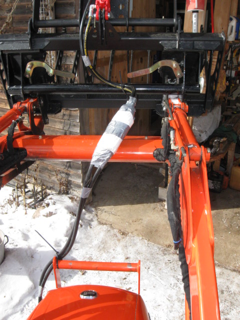 Yeah, put an L angle between the two bolts that hold the shield onto the crossbar between the loader arms. Punch two holes in it side by side. Attach the hoses to the angle and you're done. Run your slack along your loader arm and attach with zip ties of adequate size. The way you have it rigged now will be nothing but problems.:confused3:
