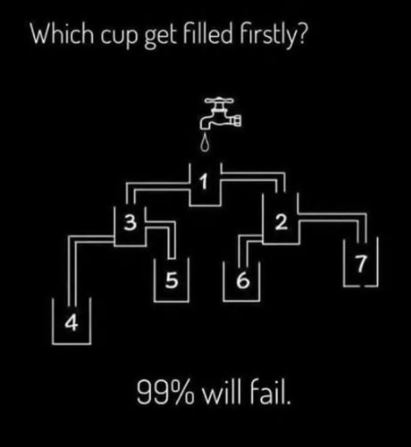 Since the "artist" is playing tricky with lines on ends of pipes representing a plug, then no cups will ever fill, as the the faucet is also plugged, and has no supply pipe.