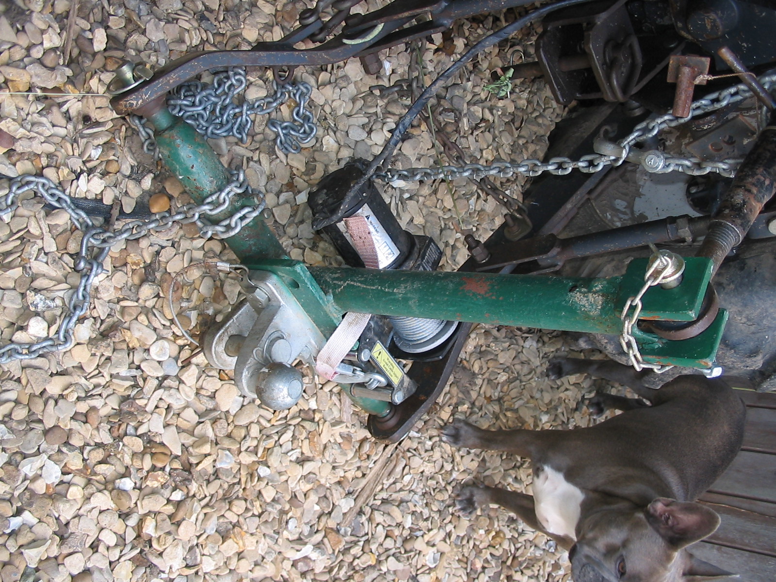 I made an inverted `T` frame out of a scaffold pole and some bottom link pin I got off Ebay. I had some hedging to pull up that had been established for 30 years plus. The way my system works with my little Iseki tractor, I lower the draught arms, and reverse to get as close to the base of the hedging as I could. Then I wrap the chain around all the stem trunks, and feed the end of the chain through the `D` shackle, and pull it as tight as I could get it. The chain is then wrapped one turn around the bottom bar of the `T` frame, and a link of the chain locked between the two pins I welded on the bar. Back on the tractor, and lift the arms. This method pulled up about half of my hedging with no problems. To help with the stubborn ones I used to reverse at the same time as lifting. Also by slowly going forward whilst lifting, would make some of the most stubborn critters let go. A word of caution though, some times my front wheels of my tractor would lift off the ground when lifting, even though I have a FEL, and more so if lifting and going forward. Another thing I found was the first chain I had, used to keep breaking when working hard. It got shorter and shorter until I had to go to my shed for another chain. The fresh chain looked exactly the same, same size, but the fresh chain has never looked like breaking. Lesson learnt, some chains are rubbish. My thinking was, that I didn`t want to spend a lot of money on a puller, that might be used for a while and then spend the rest of its life rusting in the shed. Also, my little Iseki only weighs just over half a ton, there would be no point fitting a big unit on it. T frame 2.JPGT frame.JPG