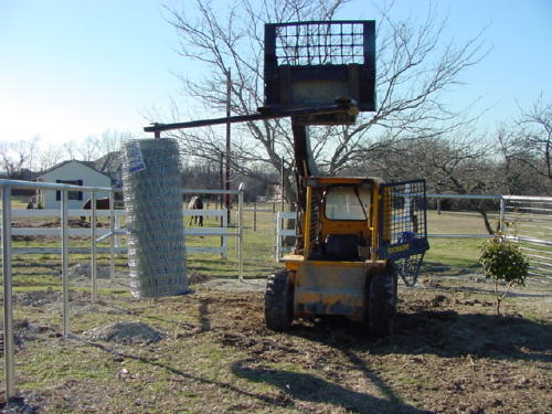 I've done a fair amount of thinking about a side-mounted woven wire unroller with a tensioner. It would be easy to mount on the power track where I could watch it. The lift and tilt controls on the attach plate would then allow precise positioning on each post.