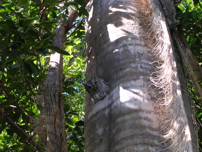) and before I could cut it down some birds had pecked out nest holes in it so I decided to leave it up until it falls down on its own. The other morning I was trimming some limbs in a nearby tree when I looked up and saw this owl staring back at me. I know for those of you who live in more rural areas this isn't such a big deal but I live about a 1/2 mile west of the Atlantic sandwiched in between Fort Lauderdale and Miami. We have the usual exotic,tropical animals like parrots, alligators, iguanas and manatees but it was really neat for me to see this owl take up residence in a palm tree in this very urban environment. Now he can keep company with the possum I see out wandering around the yard at night. I attached a photo of the owl from this past weekend and one of an iguana that was out sunning in front of my neighbors the Thanksgiving before last