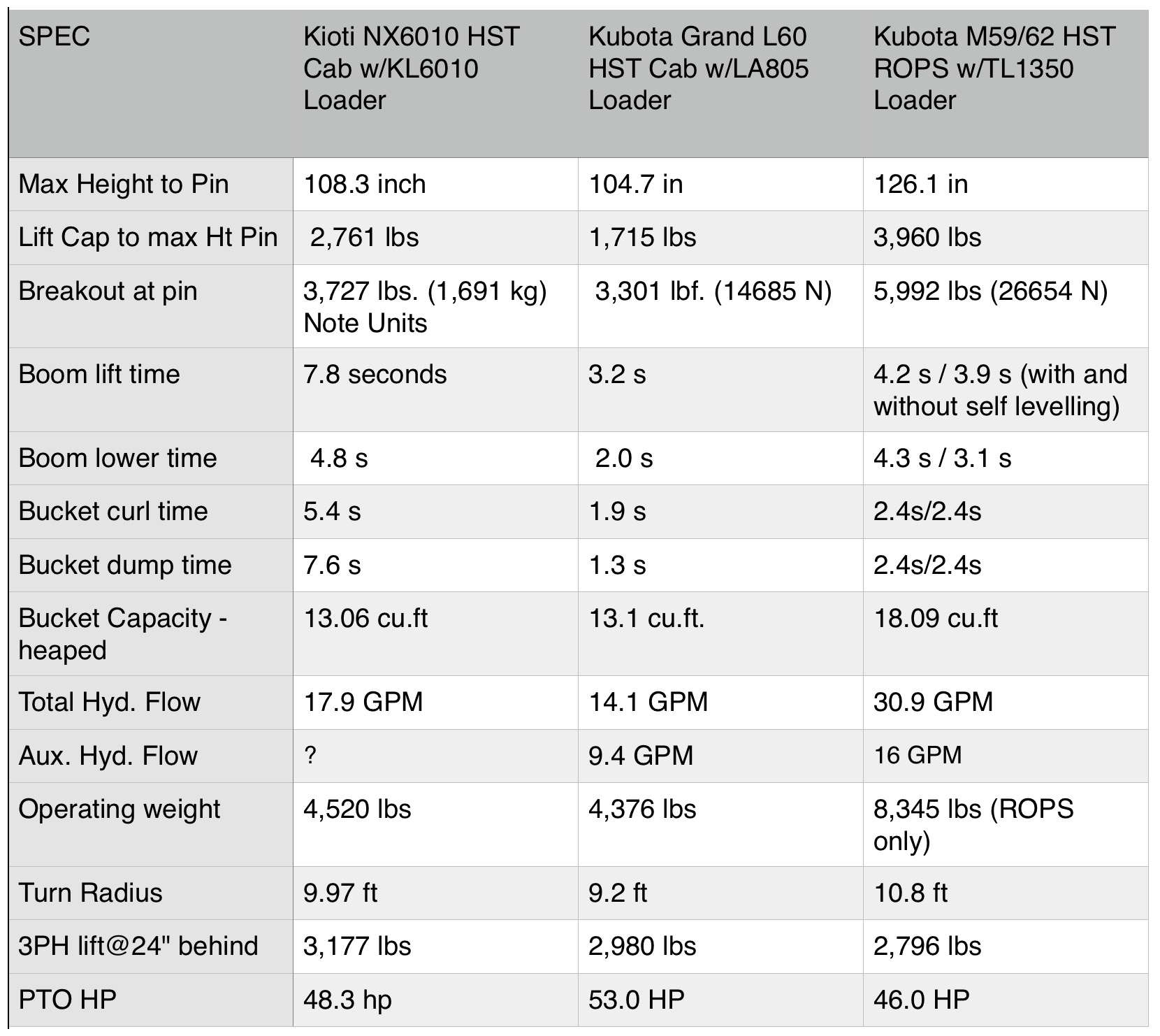 I have attached the load curves for the LA 525. I assume all manufacturers provide these, if so I would appreciate someone with a KL-4030 scanning the curves for the Kioti. This would be the best way of comparing the lift capability. From the Kubota curves it is clear the higher it goes the less it can lift and that is a very safe way to design this type of equipment, for the Kubota I will see less than half of max lift ability at full height.Many people think this....but just dont understand the rating.