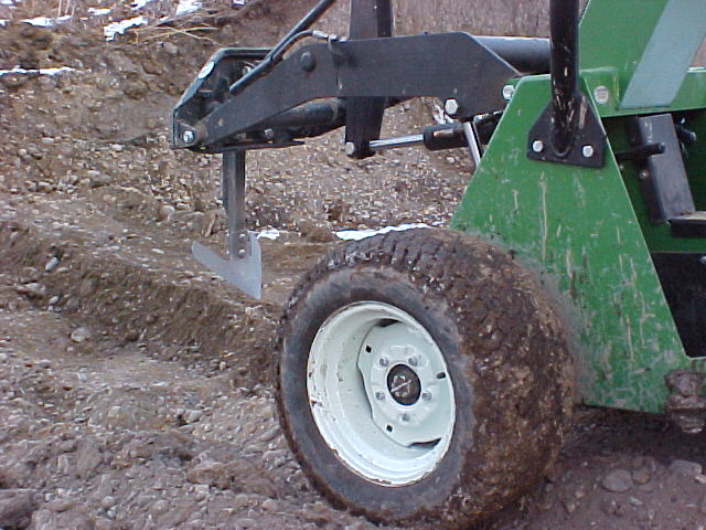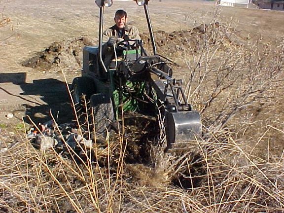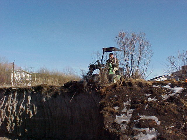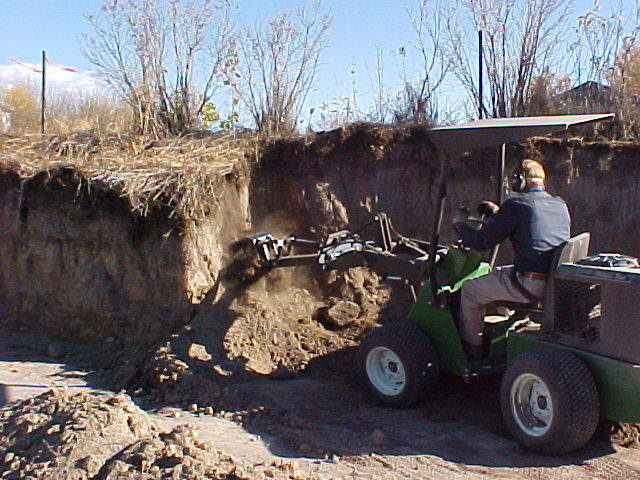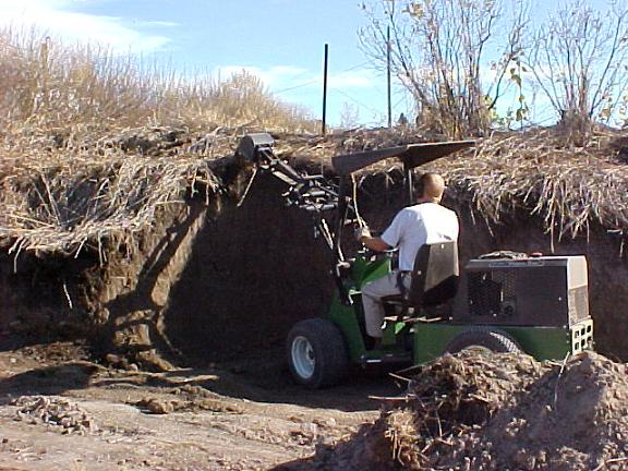 Cutting down side hill for new garage. Cut down to 10 feet below top of hill, which was about maximum reach for mini hoe. Used the bucket to rip downwards, which worked very well.