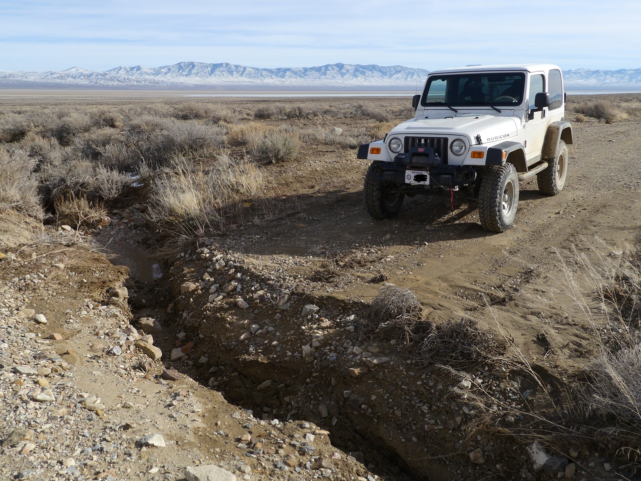 Most people who live in Nevada have no choice but to drive dirt roads - not much pavement around here. If I leave my driveway and drive due south it is 135 miles to the nearest pavement. A Jeep makes it much easier to navigate dirt roads that wash out every time there's a good rainstorm. Not many vehicles can cross a washout like this. No problem for a Jeep.