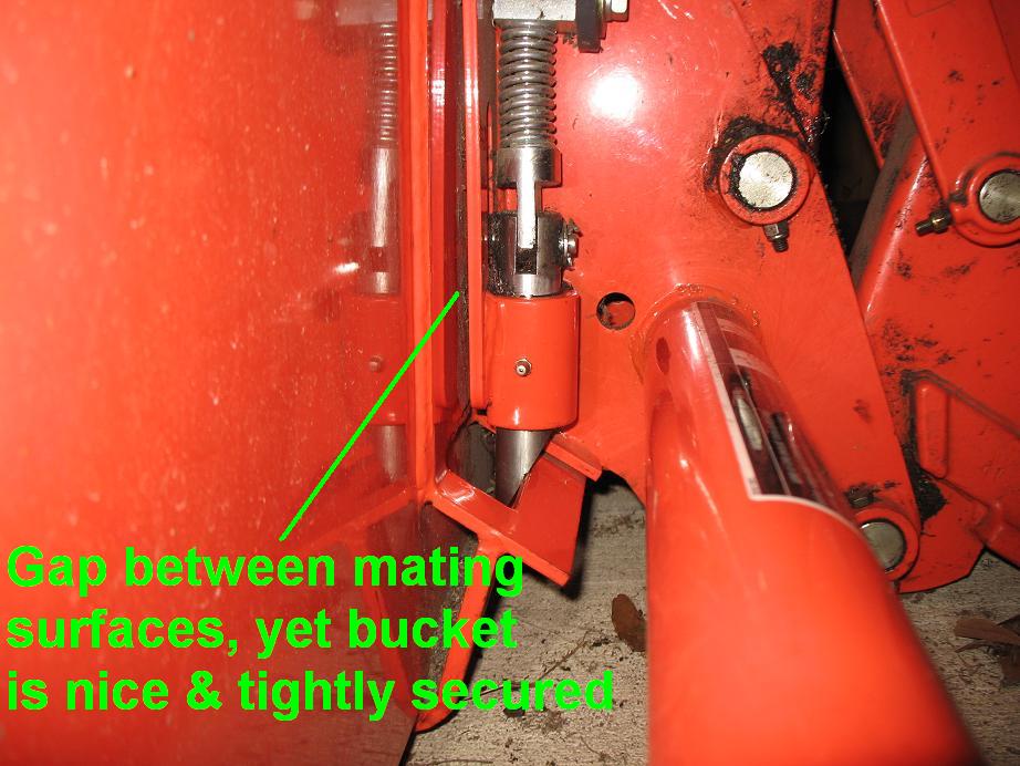 Ah-ha! I just noticed: On the OEM Kubota bucket pic below, look at the gap between the mating surfaces. I have no idea why that gap is there, but the bucket is surely secured nice-and-tight in that picture; I tried to push it all around to make sure it really is tight, & it is. The Wild Kat doesn't seem to have that gap; The mating surfaces are right against each other. Hmmmm ....
