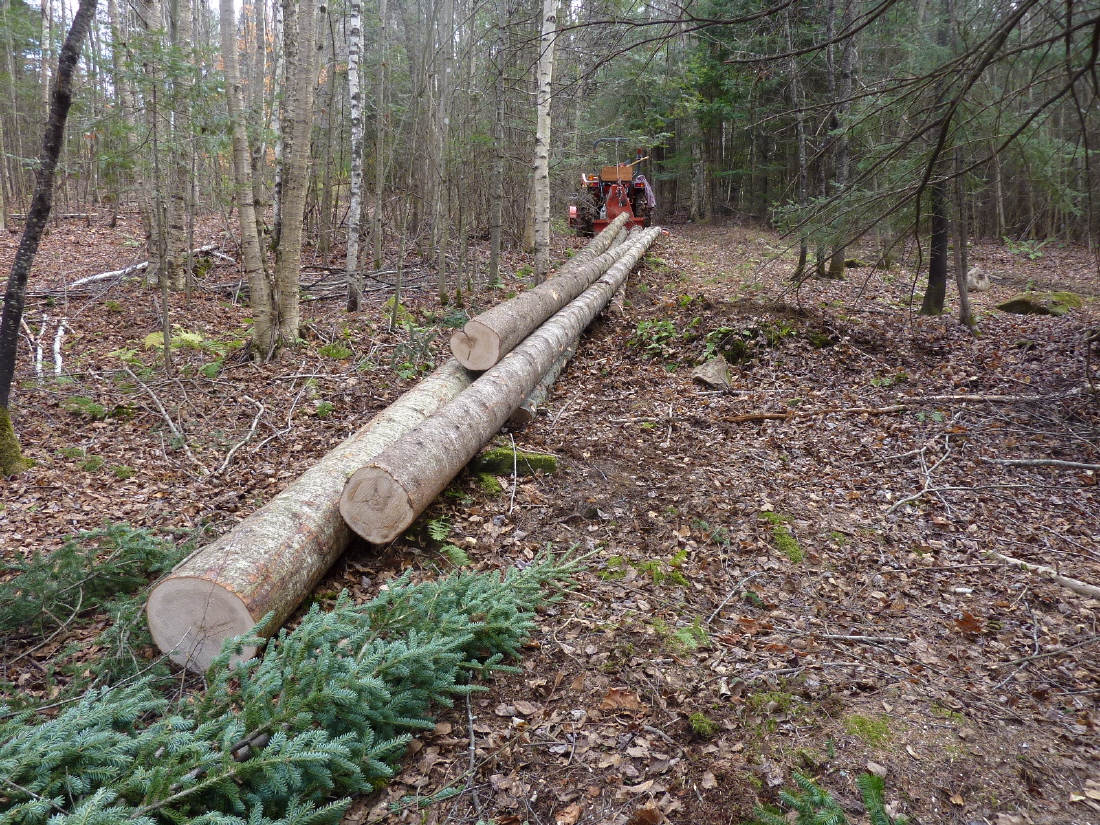 I cut a tree in the woods, limb it out, and then figure what I can get out of it for saw logs. I cut it so I can get 3 and sometimes 4 saw logs out of each length I skid. So the skid lengths tend to be between 35 and 42 feet. After the tree is cut to length where it fell I winch it to the trail side and leave it and go cut the next tree. I might get enough for several hitches bunched up.