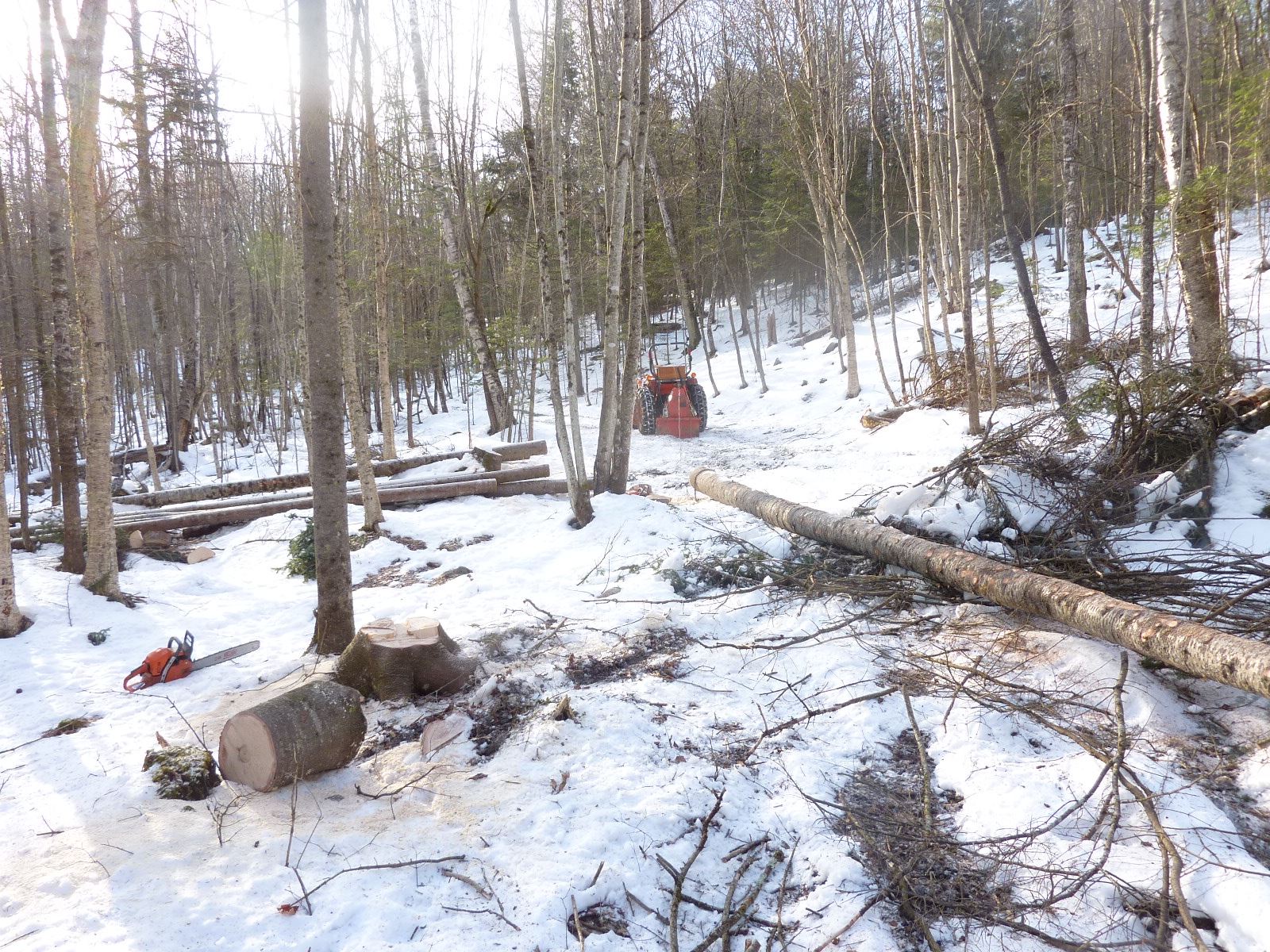 Then I position the tractor to gather a hitch from the trail side logs