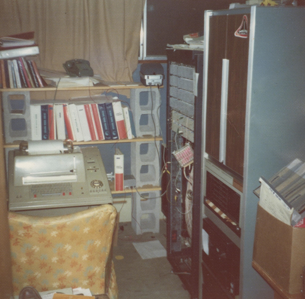 I still have the PDP-8 I bought in high school in 1972 in the basement. Here it is in 1975, just before I build a video terminal for it. The jump from 110 baud to about 50K board was quite something. The rack unit next to it is where I converted the interface bus (DEC and -3) to TTL so I could build stuff for it.