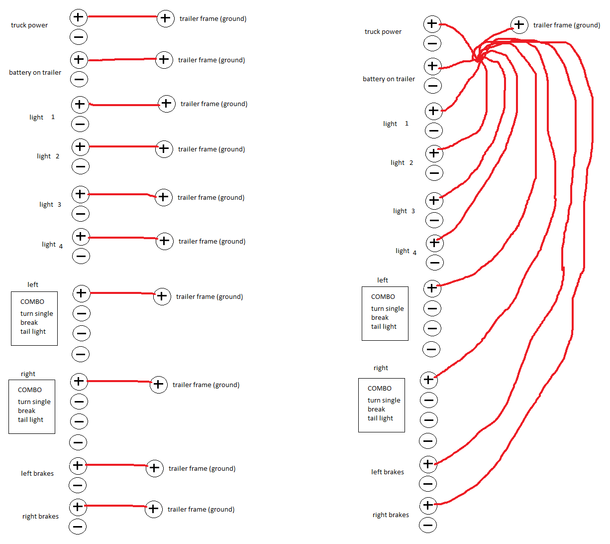 draw yourself up a diagram of all the lights, brakes, switches, etc.... you have on trailer and how they connect. would by my first suggestion. with detail of how the ground wires also connect from each unit.