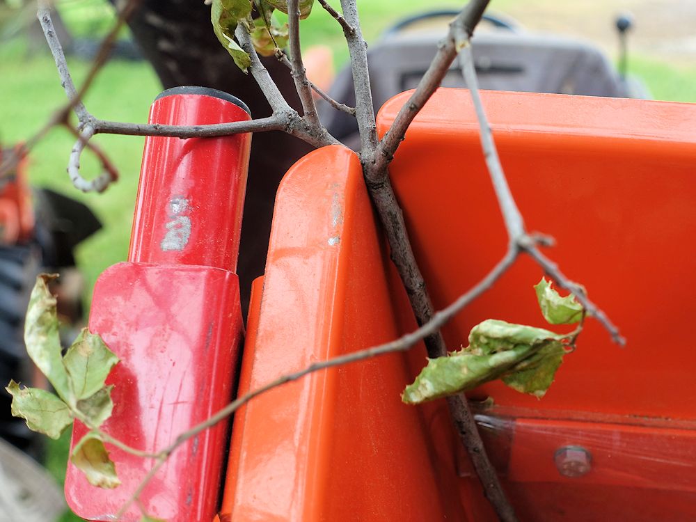 - The threaded shaft between hydraulic valve and safety bar was too long, causing the bar to sit beyond the top of the hopper when in feed position. Side branches would bump the bar into neutral, stopping the feed. So I shortened the shaft so the bar sits below the rim of the hopper as shown below.