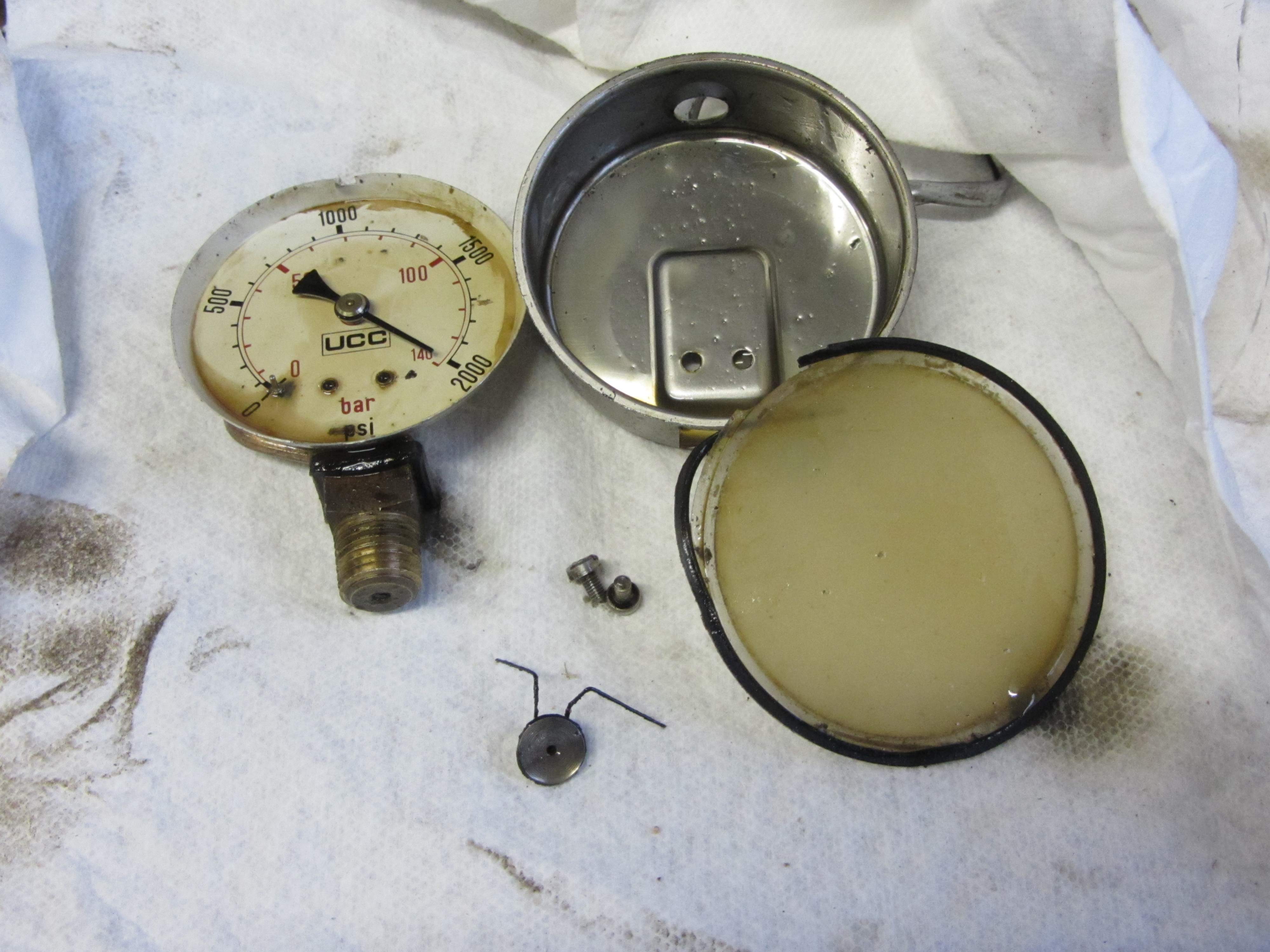 So First picture My old gage. Face plate was so yellow it was hard to see and the needle was wrong side of zero. So I took it apart. Did anyone know the whole case is filled with gycerine. I think the needle was the wrong side of zero is because it was so cold. It only went to 2000 psi anyway.