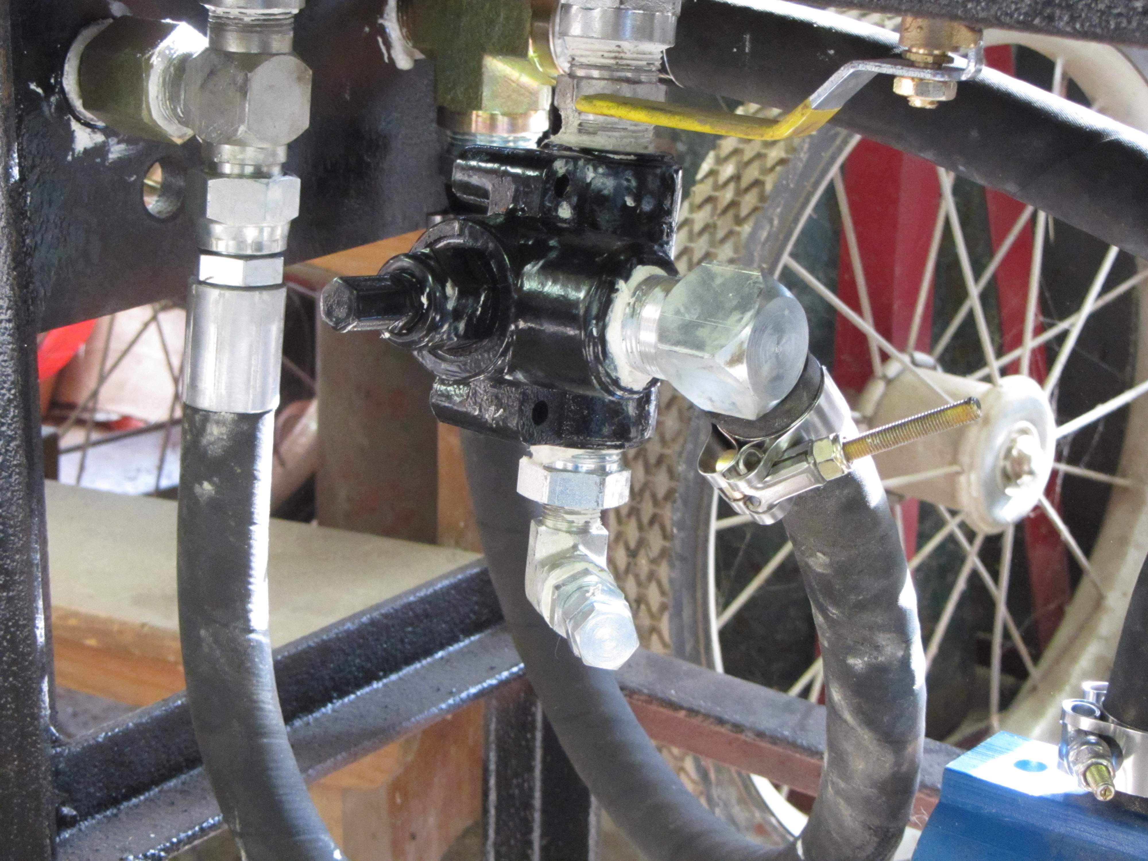 I bit the bullet and ground out the tacks on the vertical member of the lift cylinder anchor. Moved it back around 3 inches. Moved the bolted sections around a bit and I think it's fine now. Just above horizontal on lift and about an inch of travel left on the cylinder when down. A little more horizontal element to the cylinder. I think there is plenty of room for the cylinder fittings on the back side. I also finished the plumbing on the pump unit. Relief valve is installed.