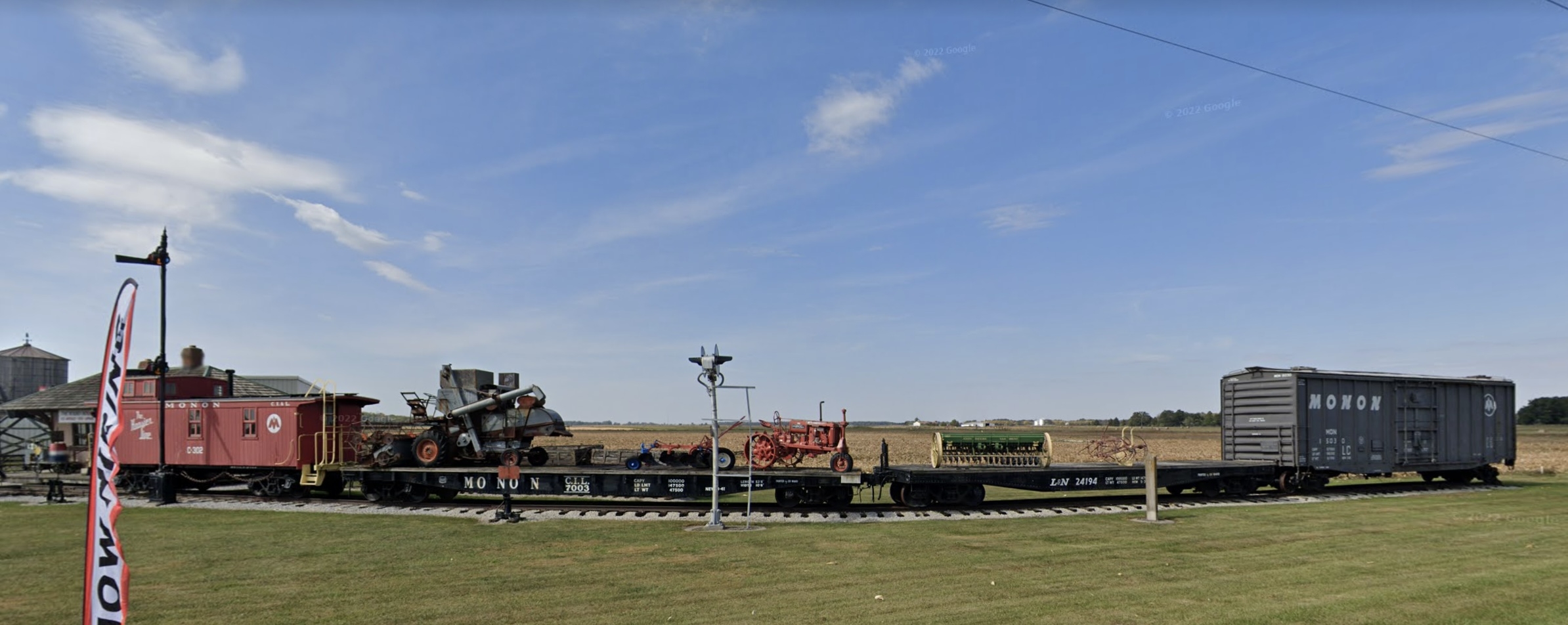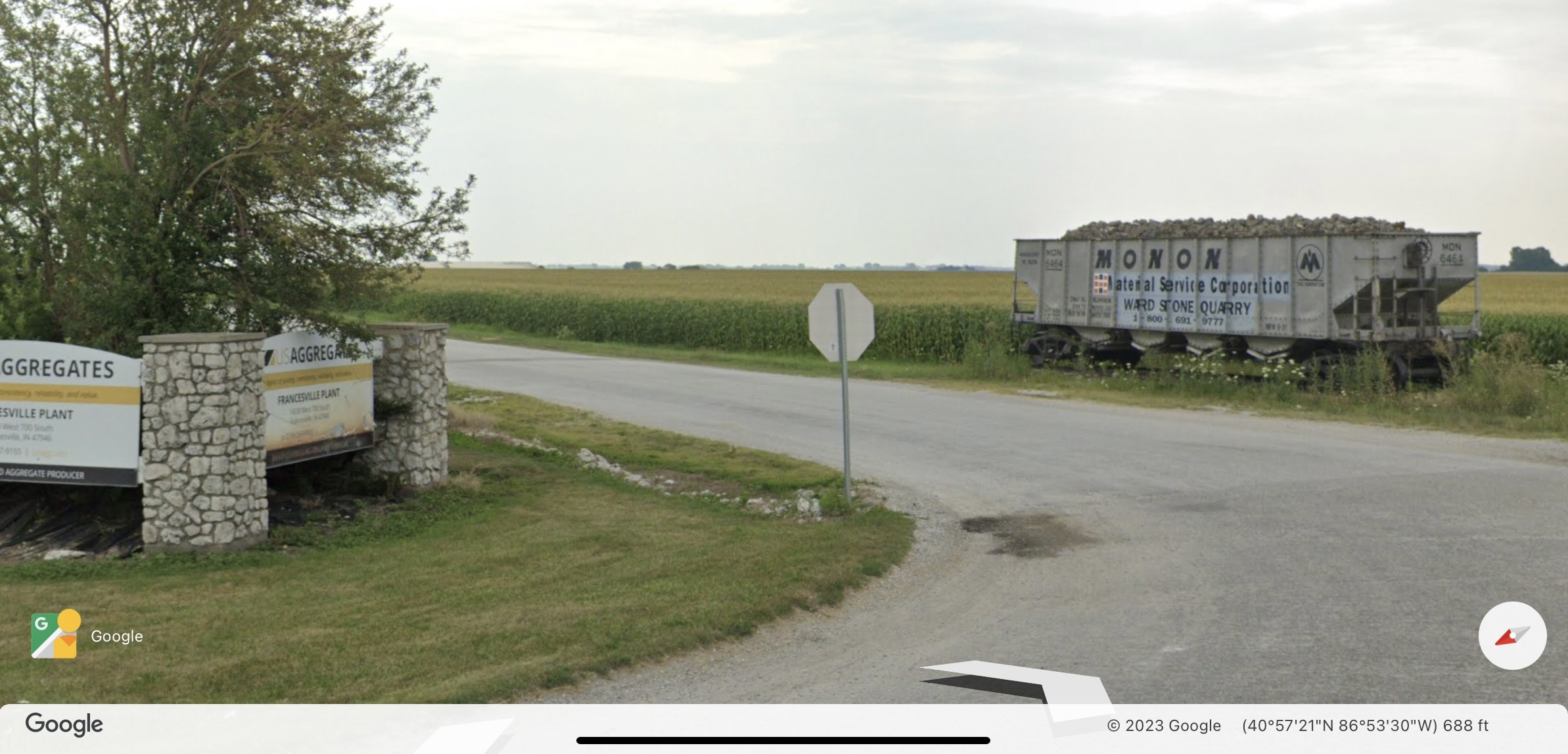 The railroad runs parallel behind the quarry on old Monon trackage. That RR car is an old Monon car and sitting on a section of track they placed there perpendicular to the road for advertising. Just a piece of local history.So that’s just a sign or a prop for the quarry placed there? Not an abandoned railroad?