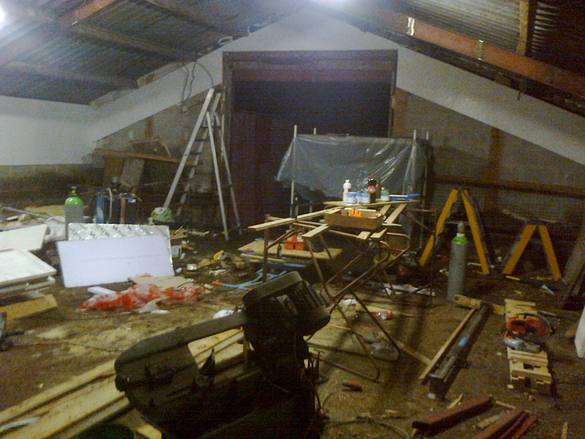 Since August i rent a place with a workshop. That means, its a chicken barn with a wooden roof structure that was severely sagging, despite previous patchwork. Together with some other folks who have a section of that barn as workshop for their derby racing cars, we started to fix this section of the barn too before i officialy start to rent it: They had built the roof in 1965, yet we are putting up a supporting structure anno 2012