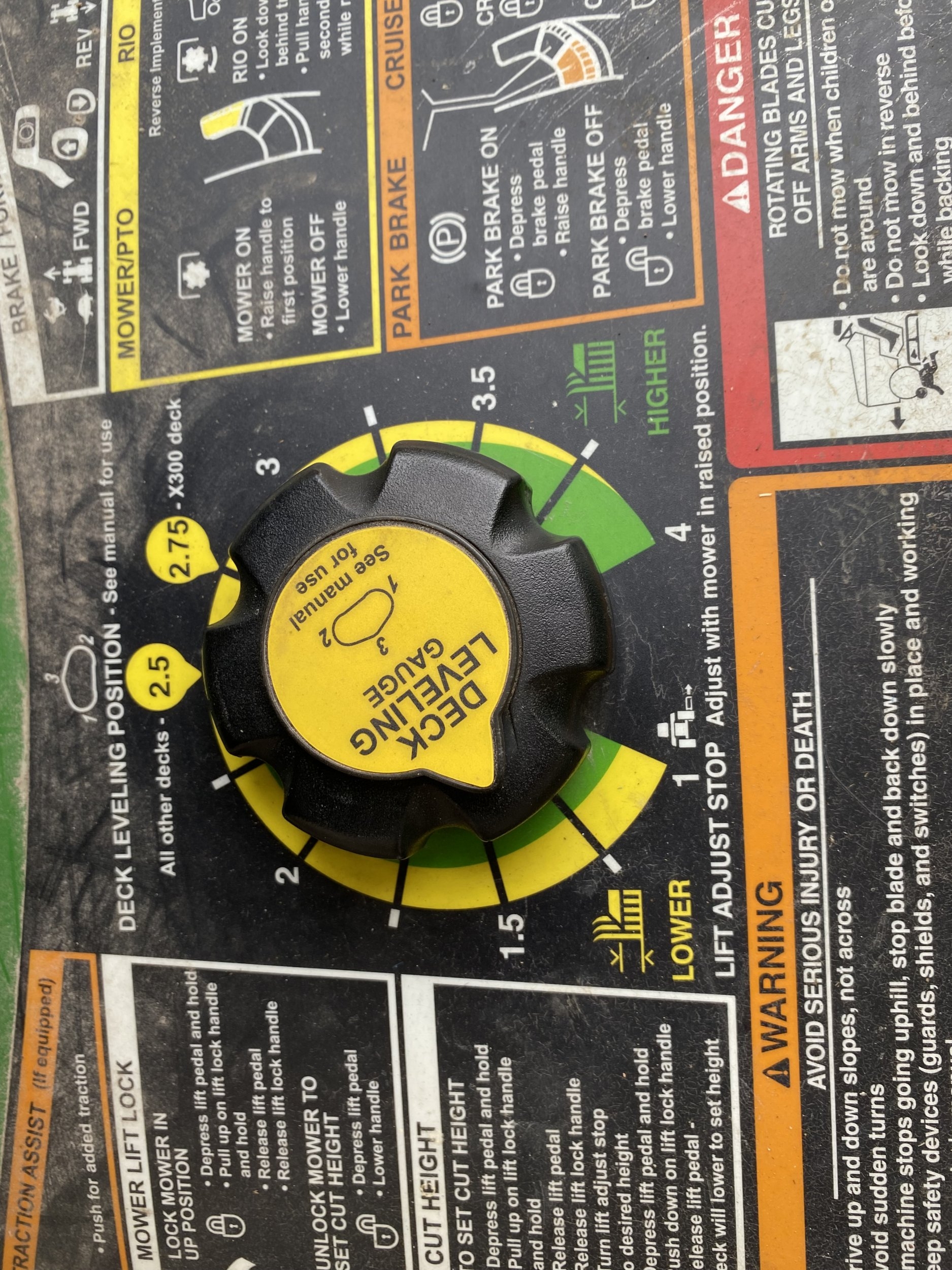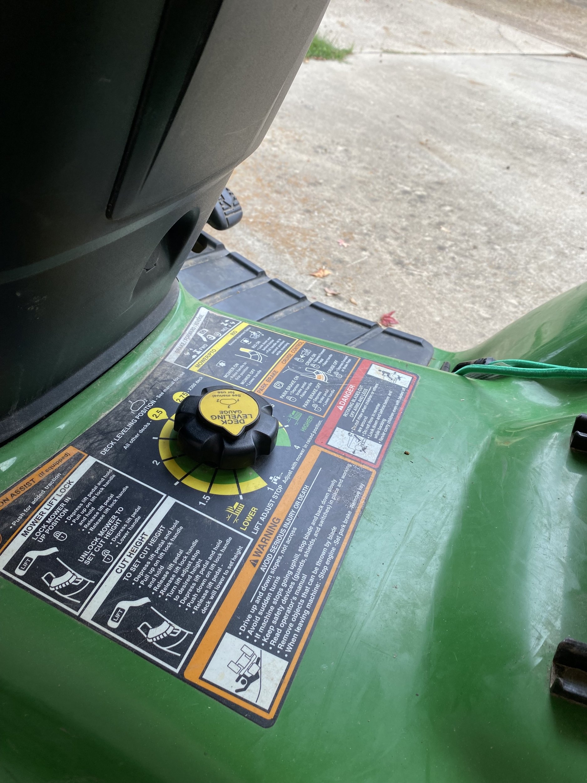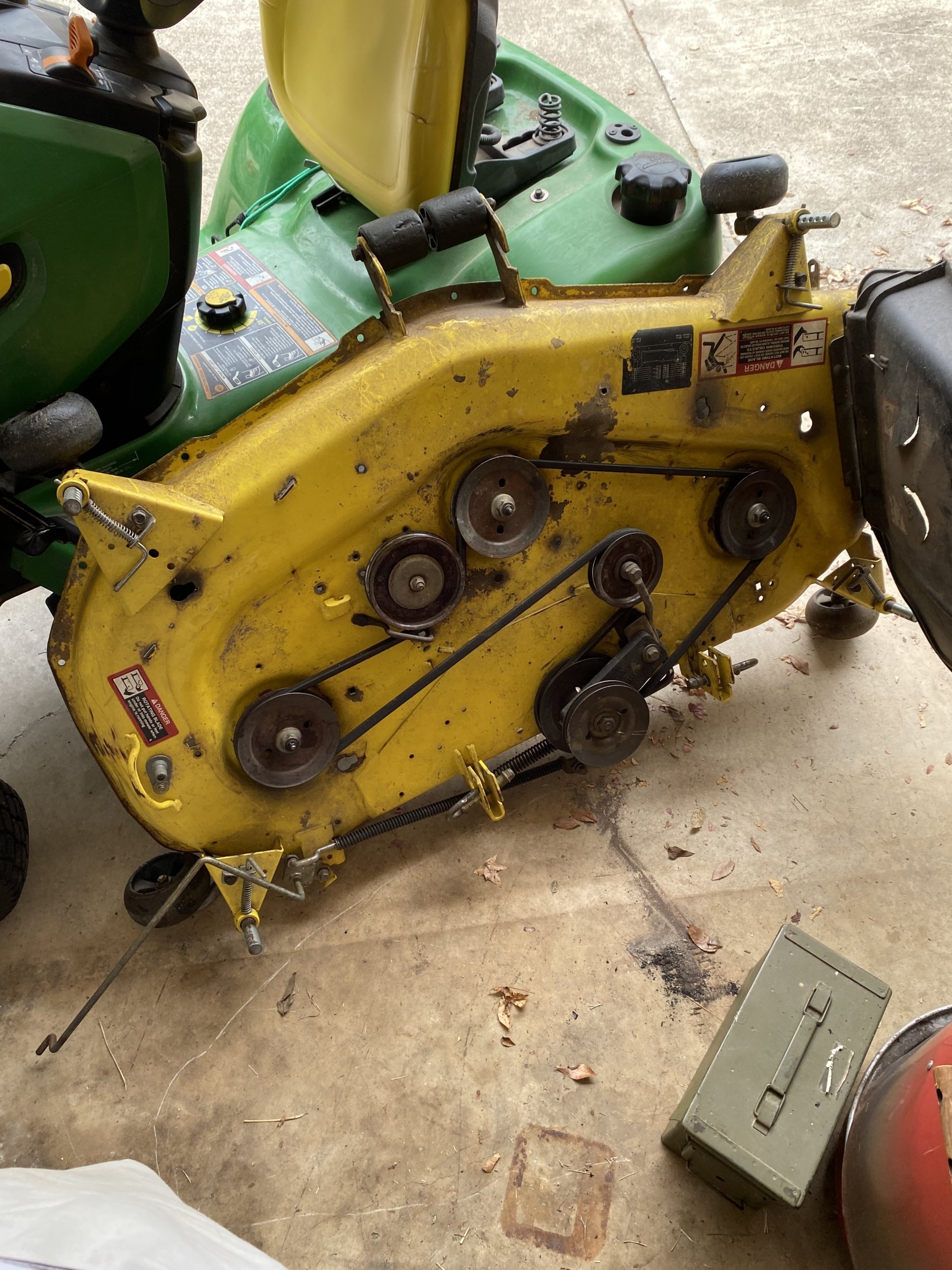 Well, I haven’t been turning any wrenches on the unit. I’ve tried to pull and push on underneath parts, but nothing. So, can you give me a part number or numbers to look at from the exploded view?I had it happen once back in the day, where the deck height adjustor got unhooked and was above whereas it needs to be below. i.e. the deck can be raised above the "hook" and when lowered the "hook" doesn't allow it to go below the set height. It is carried on that hook.