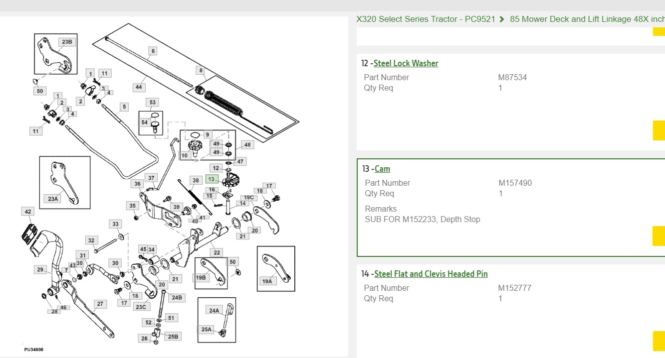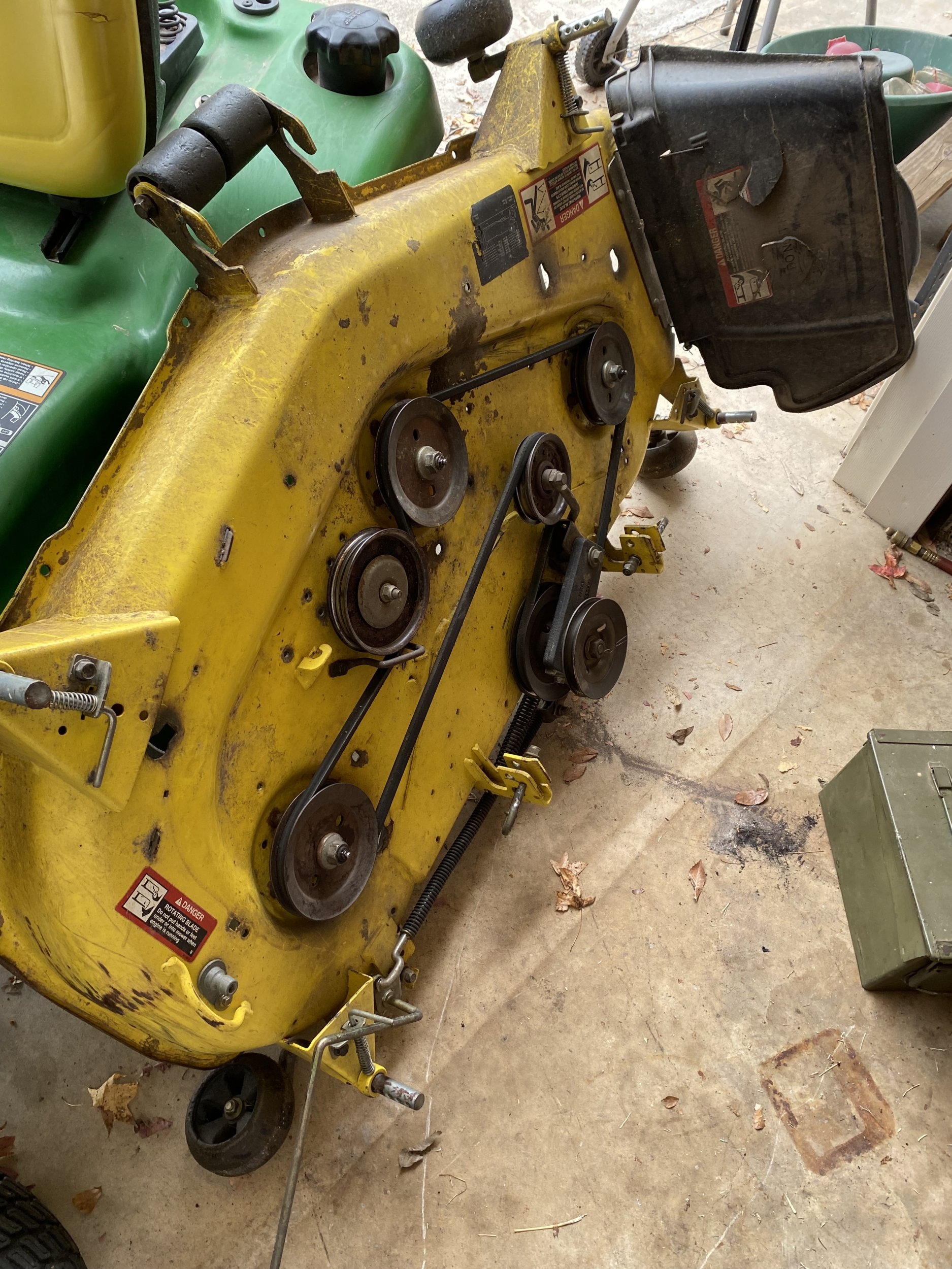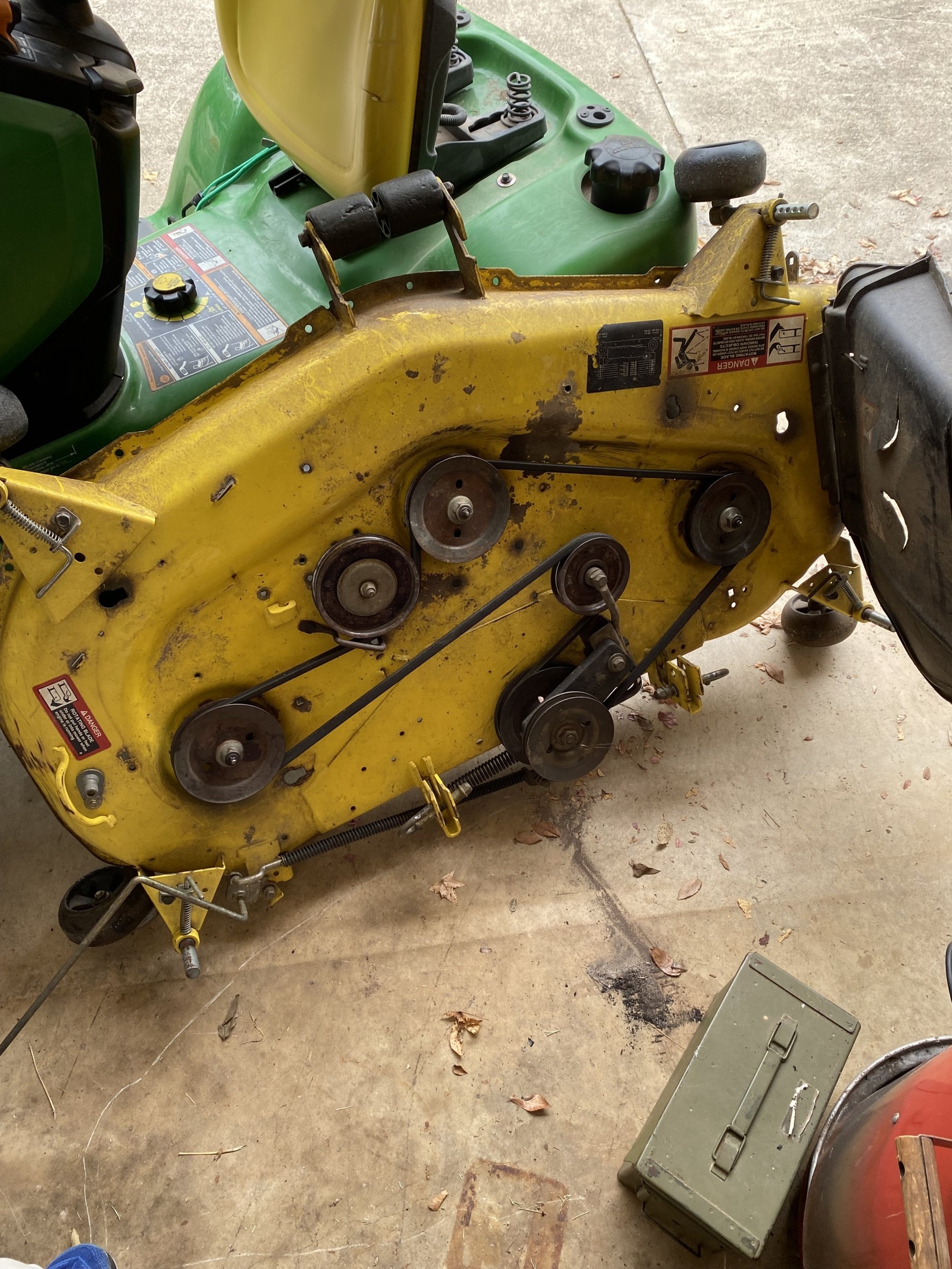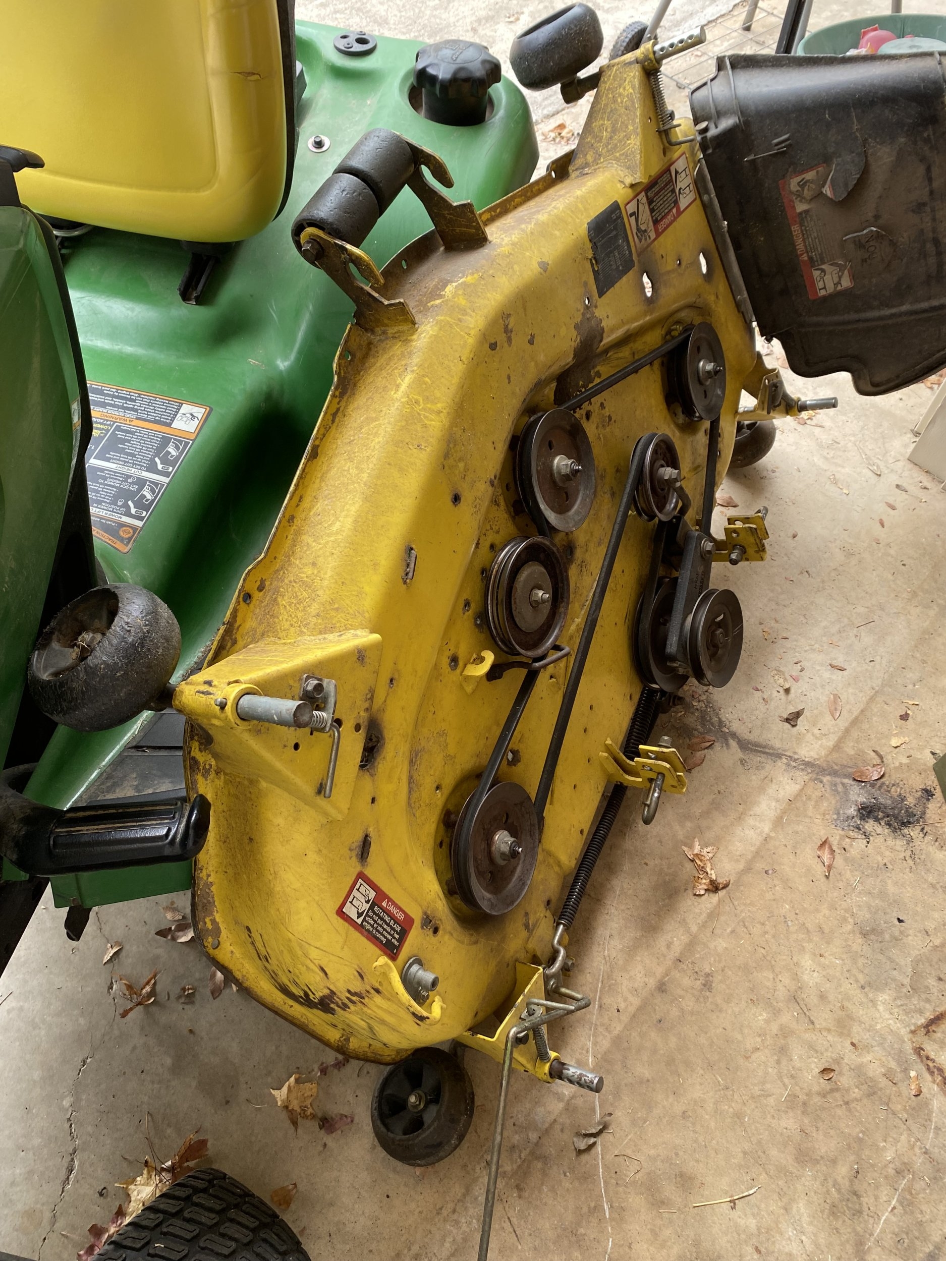 Well, I haven’t been turning any wrenches on the unit. I’ve tried to pull and push on underneath parts, but nothing. So, can you give me a part number or numbers to look at from the exploded view?I had it happen once back in the day, where the deck height adjustor got unhooked and was above whereas it needs to be below. i.e. the deck can be raised above the "hook" and when lowered the "hook" doesn't allow it to go below the set height. It is carried on that hook.