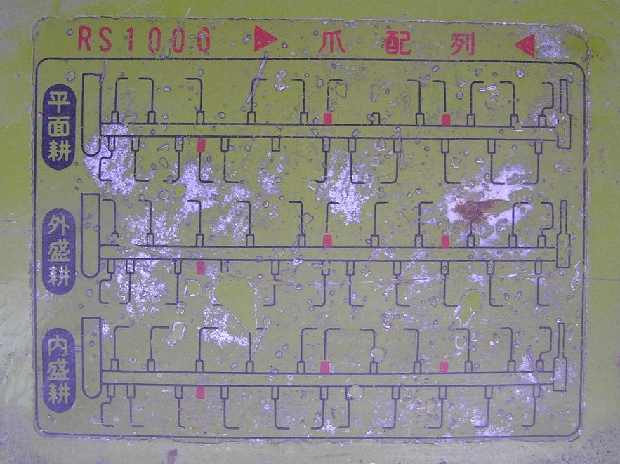 Just guessing, but the bottom shows all tines on each half the same. Seems they would move the material either toward the center, or move material to both ends. Wish I learned Japanese so I could be sure. Good luck.I know from passed experience that one of these tine configurations makes nice potato ridges, but I cant remember which one, and diagram is in Japanese. Anyone know? Thanks.